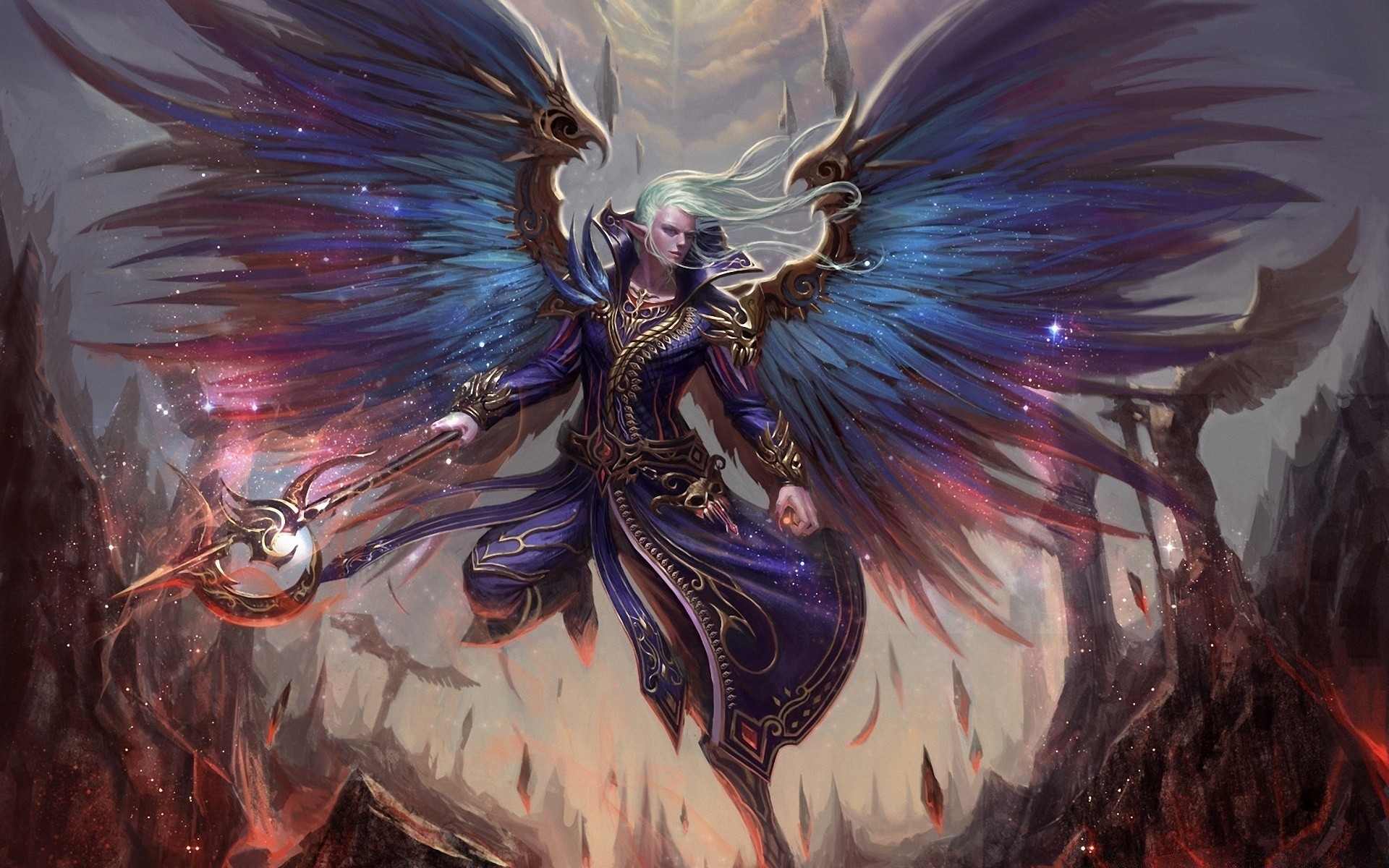 Schöne Fantasy-Zeichnung eines geflügelten Mannes mit Stab