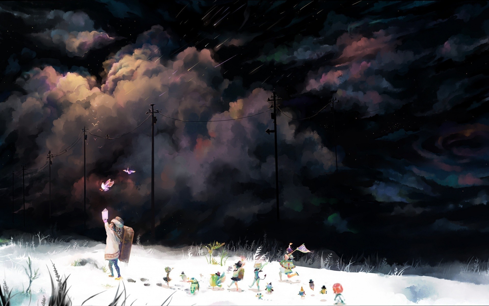 Mädchen mit einem Fan mit Vögeln im Fantasy-Stil