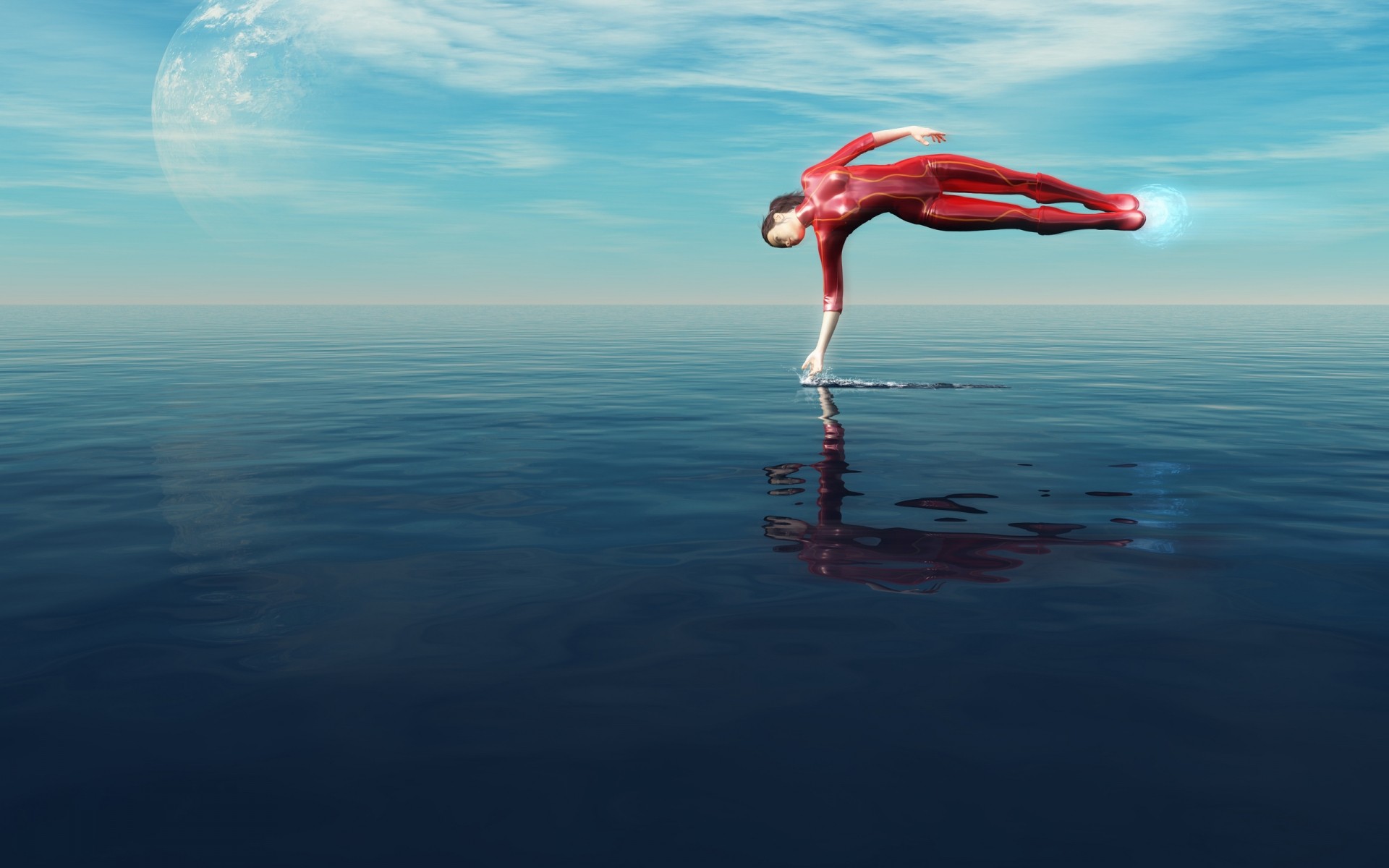 Fliegendes Mädchen aus der Zukunft über dem Ozean