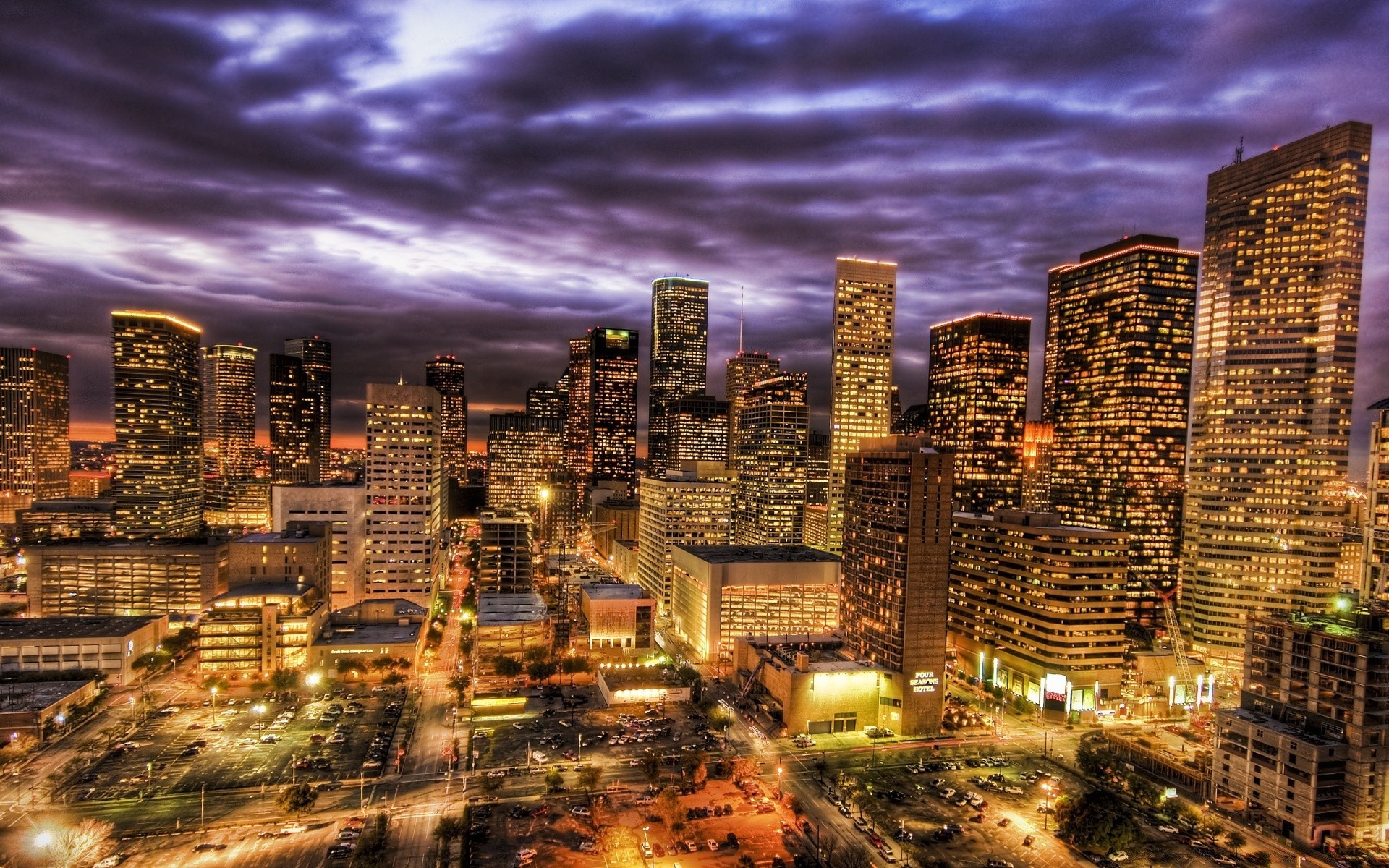 Schöne Stadt bei Sonnenuntergang aus der Vogelperspektive