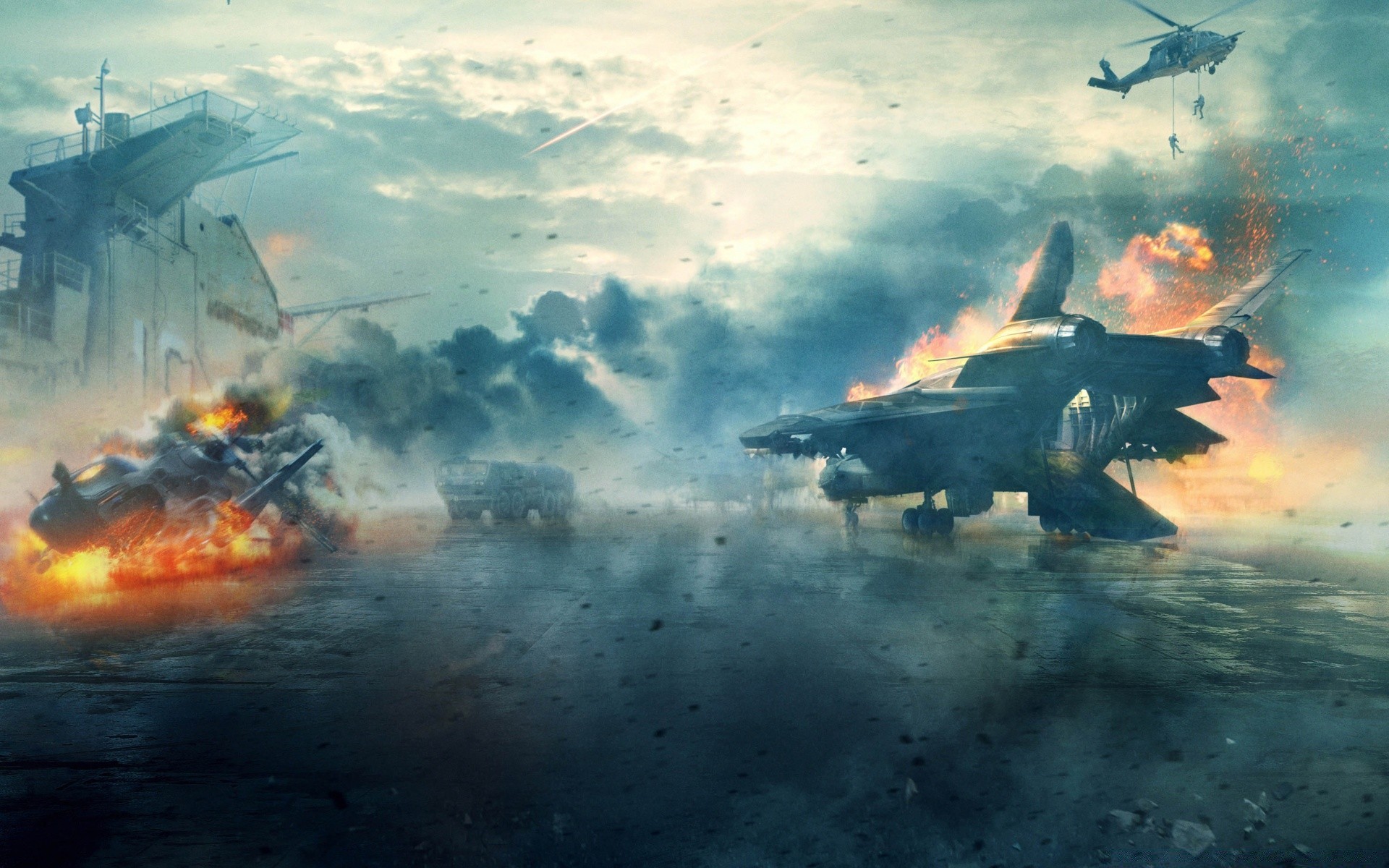 Erster rächer, auto und militärflugzeuge in flammen