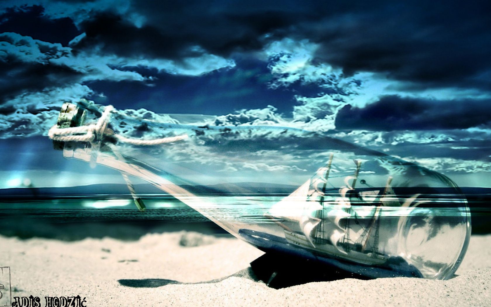 Eine Flasche mit einer Notiz wird am Strand liegen