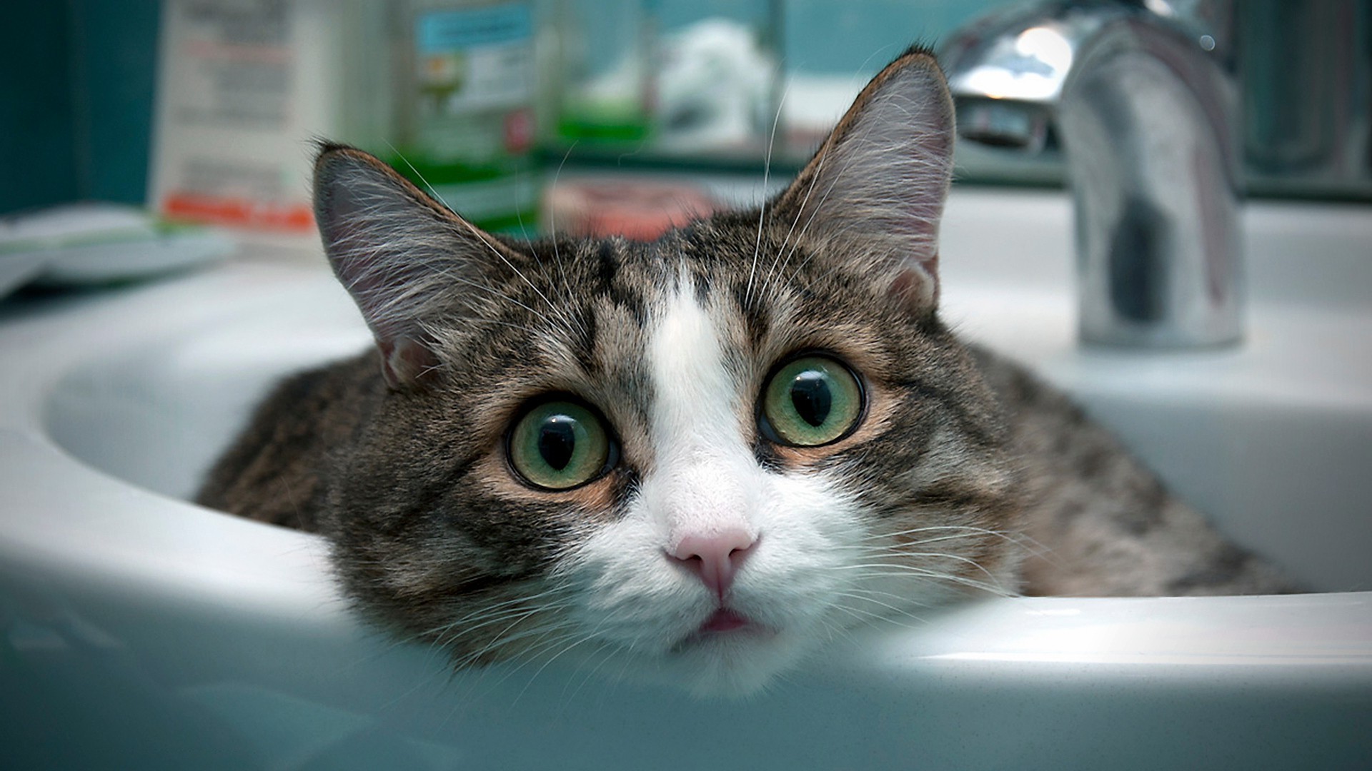 Eine Katze auf einem verschwommenen Hintergrund schaut zu