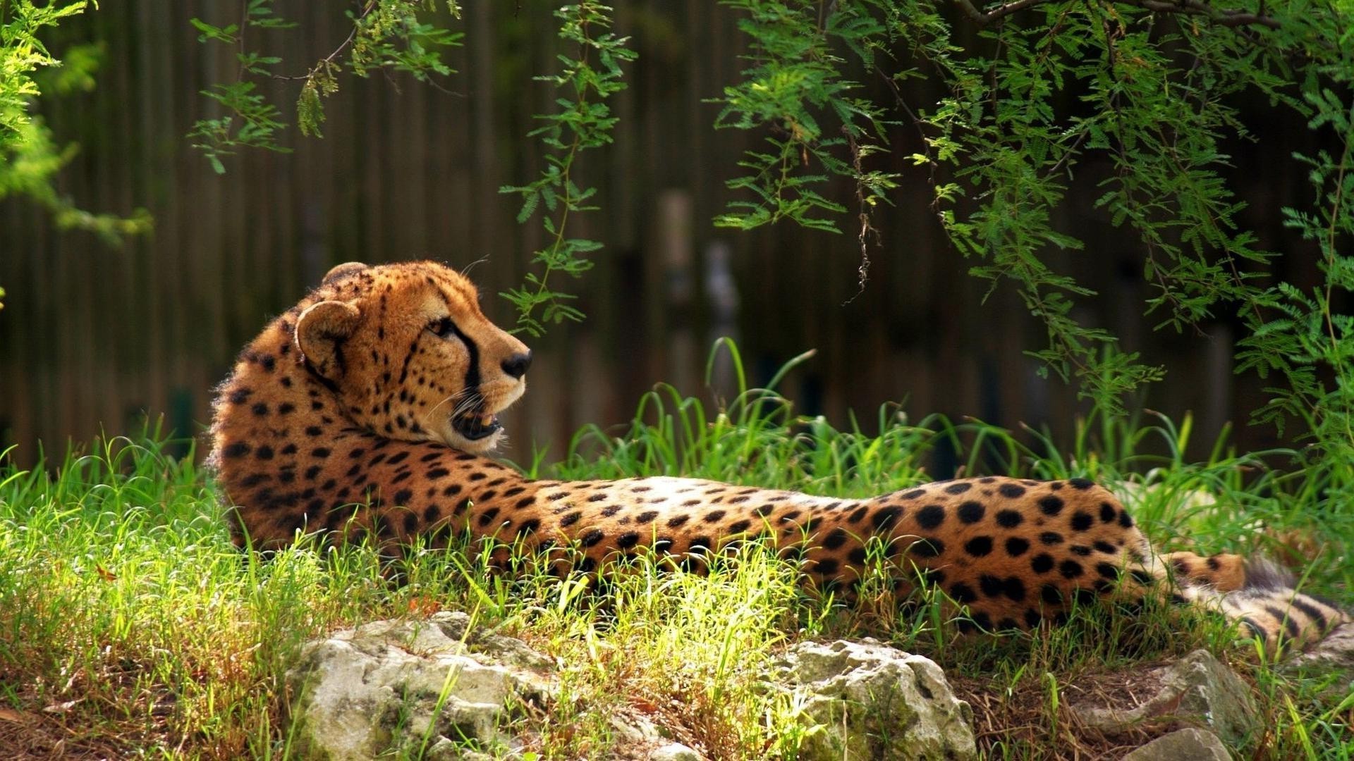 Der gepard liegt auf den klumpen vor dem hintergrund des waldes
