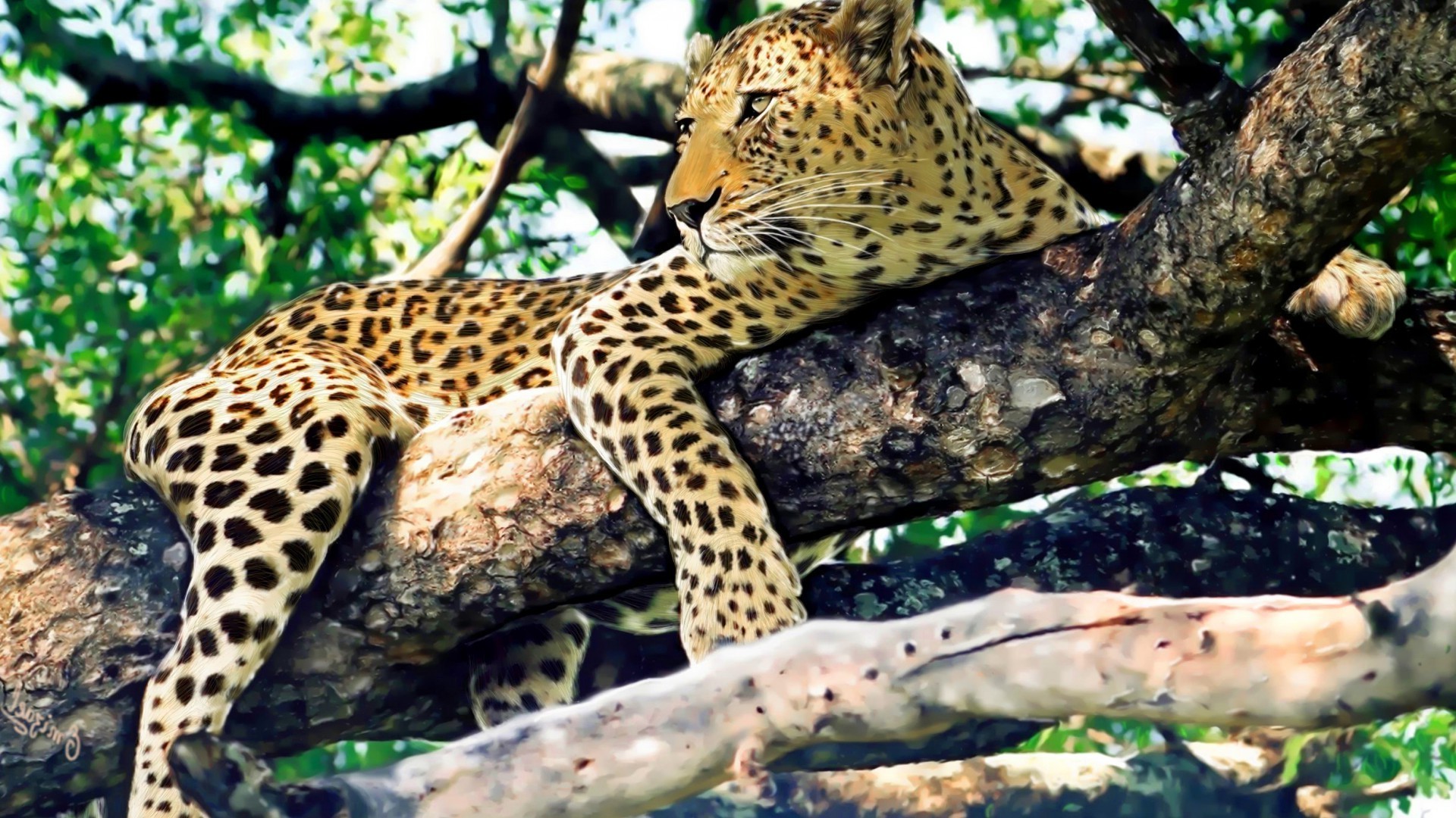 Ein Leopard ruht auf einem Baum. Wildtiere