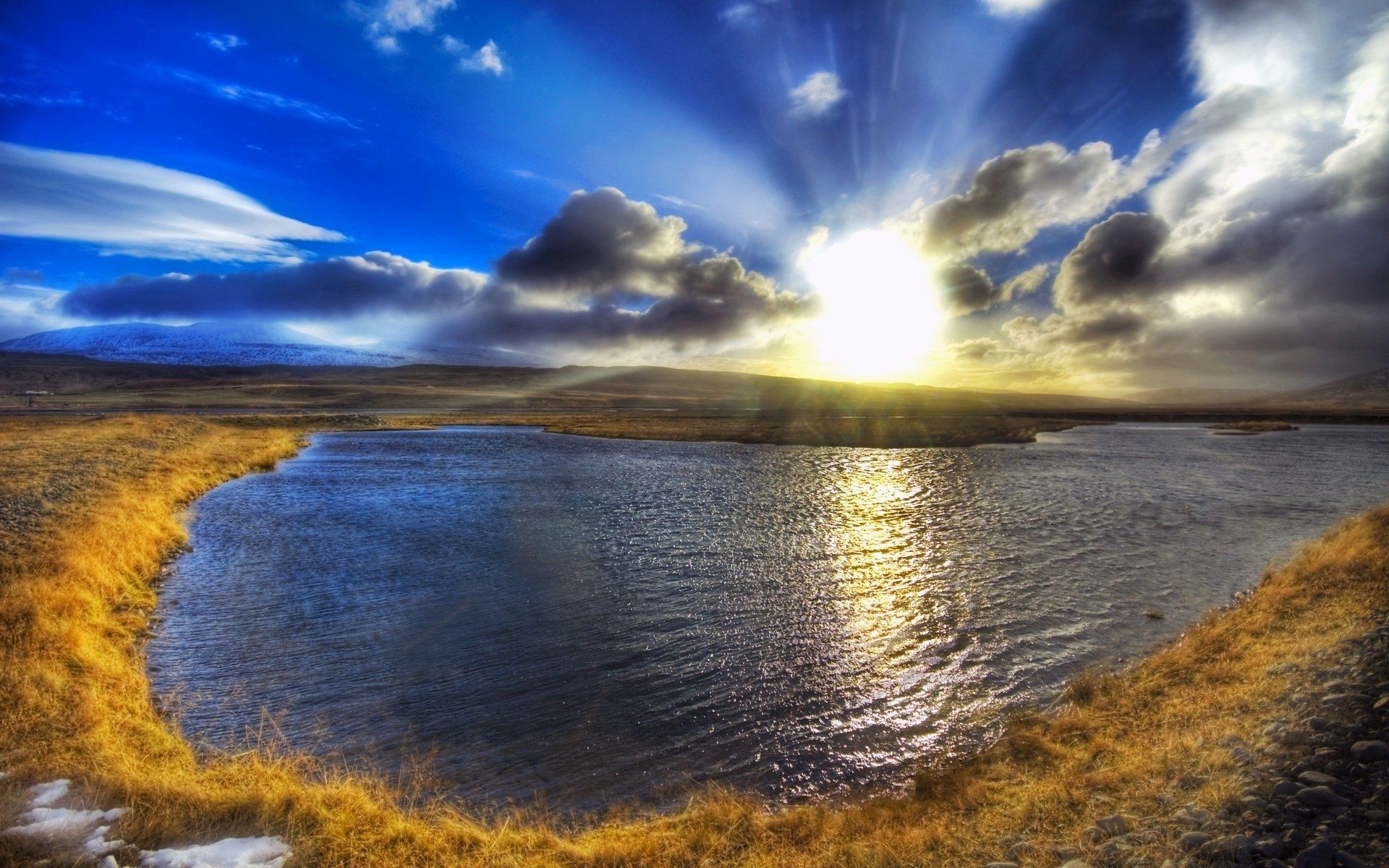 Landschaft mit Sonnenuntergang und Wasserblick
