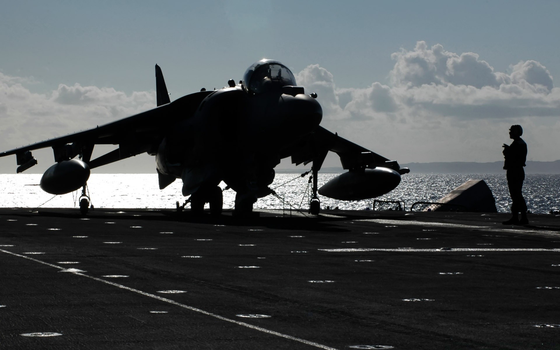 Ein Kampfflugzeug auf einem Flugzeugträger eine Minute vor dem Start