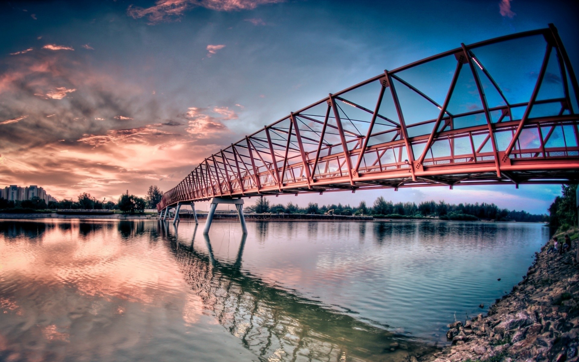 Brücke über dem fluss im hintergrund des sonnenuntergangsBrücke über dem Fluss im Hintergrund des Sonnenuntergangs
