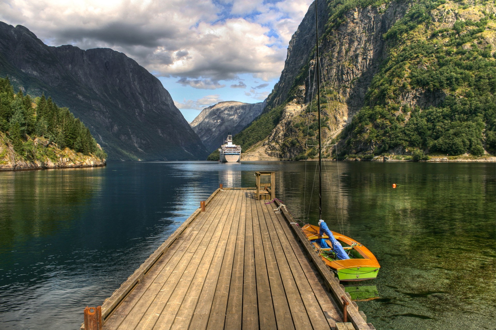 Landschaft der Berge auf dem Hintergrund von Grün und Wasser im Sommer