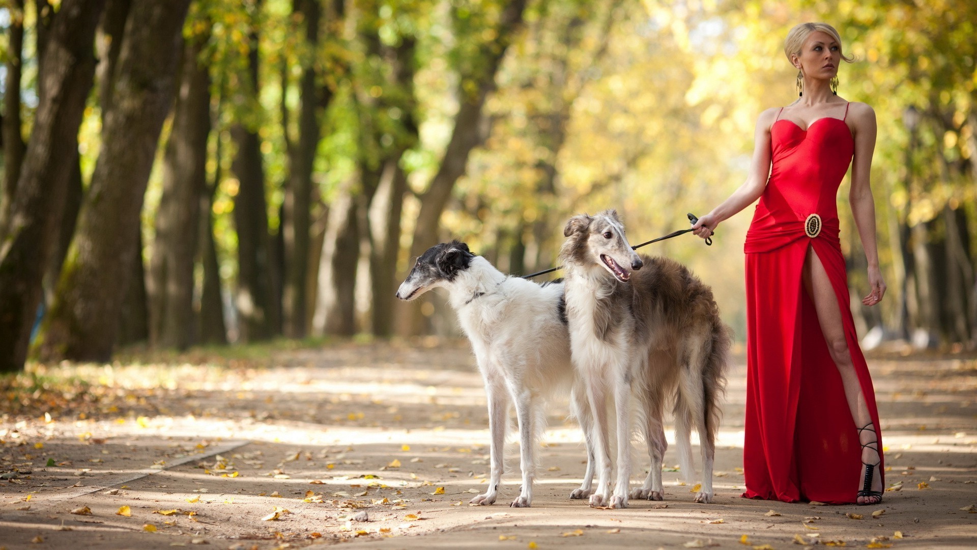 Monochromes Foto von einem Mädchen mit zwei Hunden in der Natur