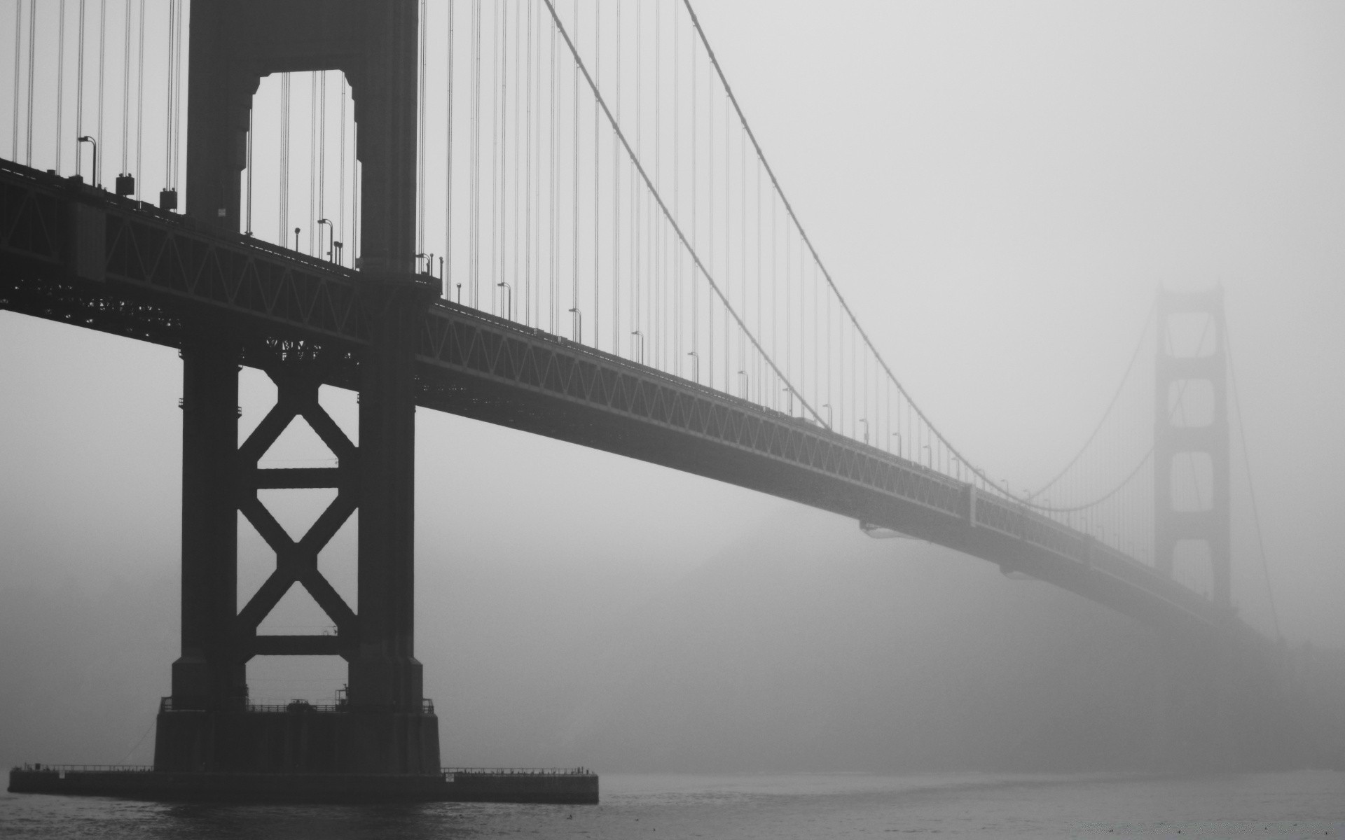 Schwarz-Weiß-Foto einer Hängebrücke im Nebel
