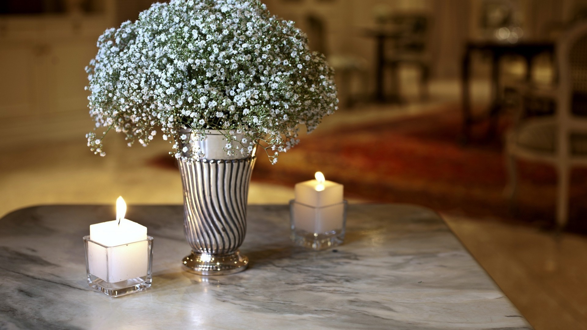 Zwei Kerzen und Blumen in einem Topf