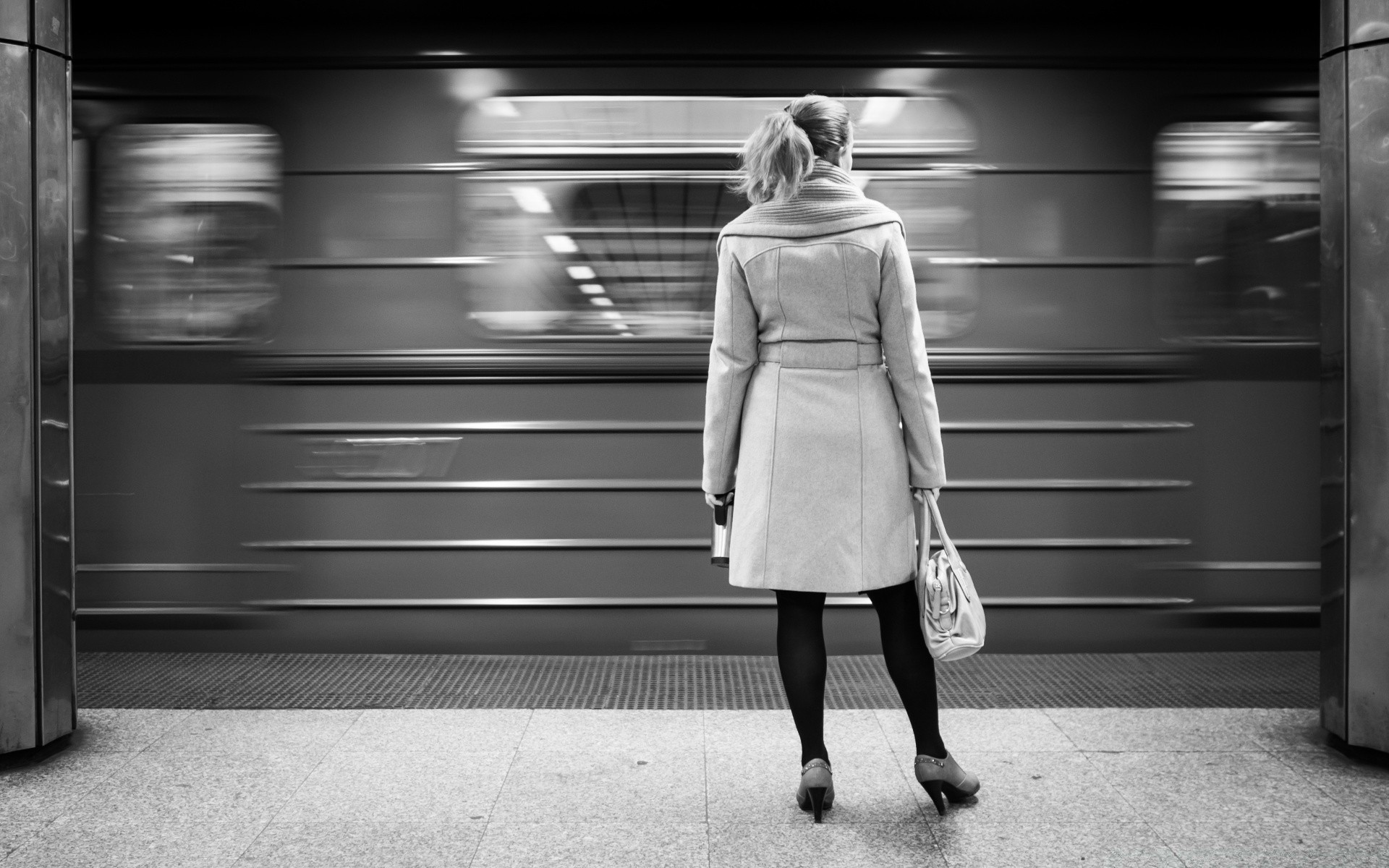 Frau steht in der U-Bahn auf schwarzem und weißem Hintergrund