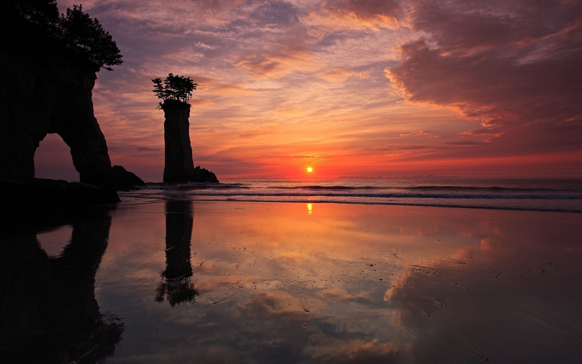 Der Sonnenuntergang am Meer spiegelt sich schön im Wasser wider