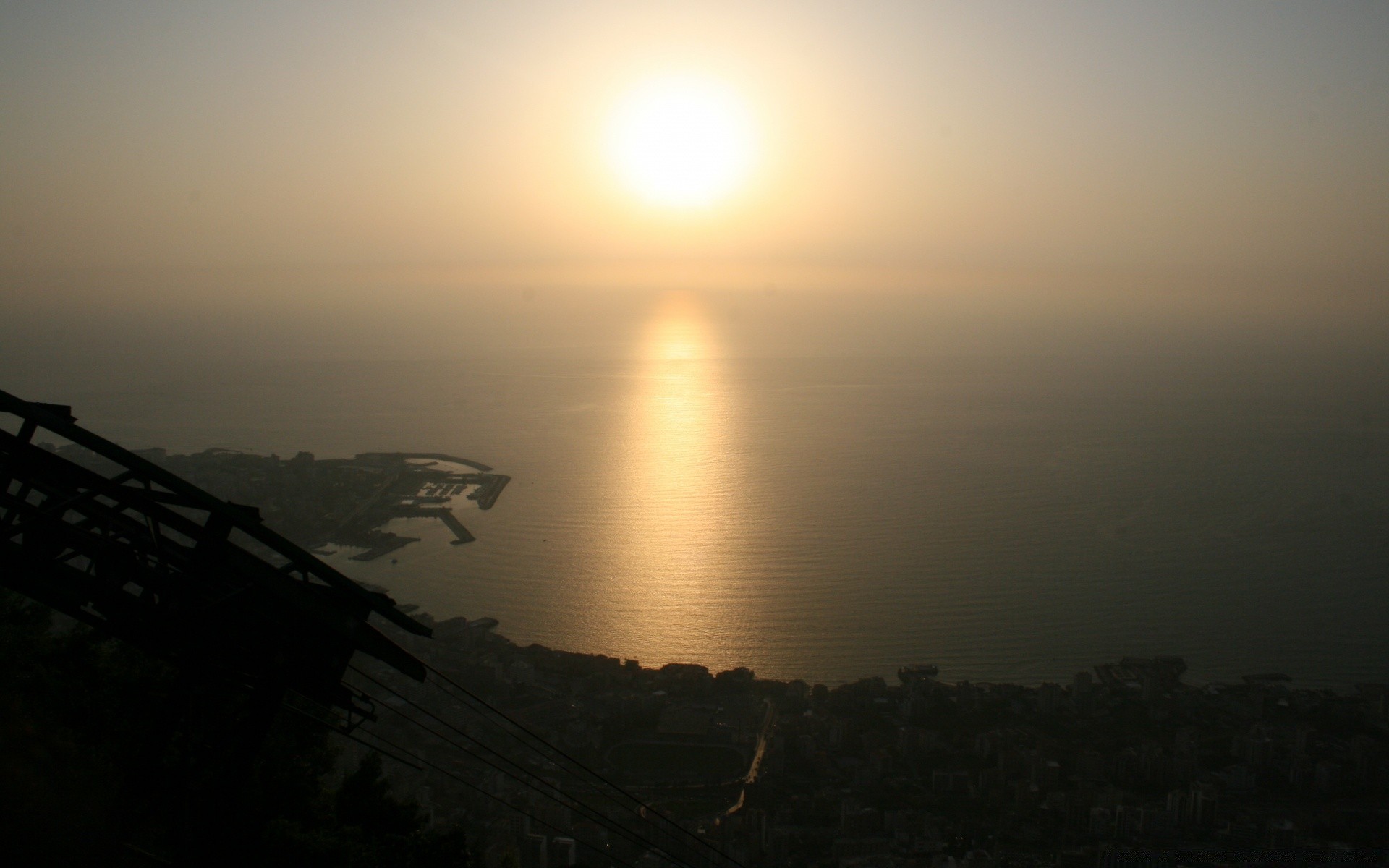 Der Sonnenuntergang verbirgt sich hinter dunklen Häuserdächern am leuchtend orangefarbenen Himmel