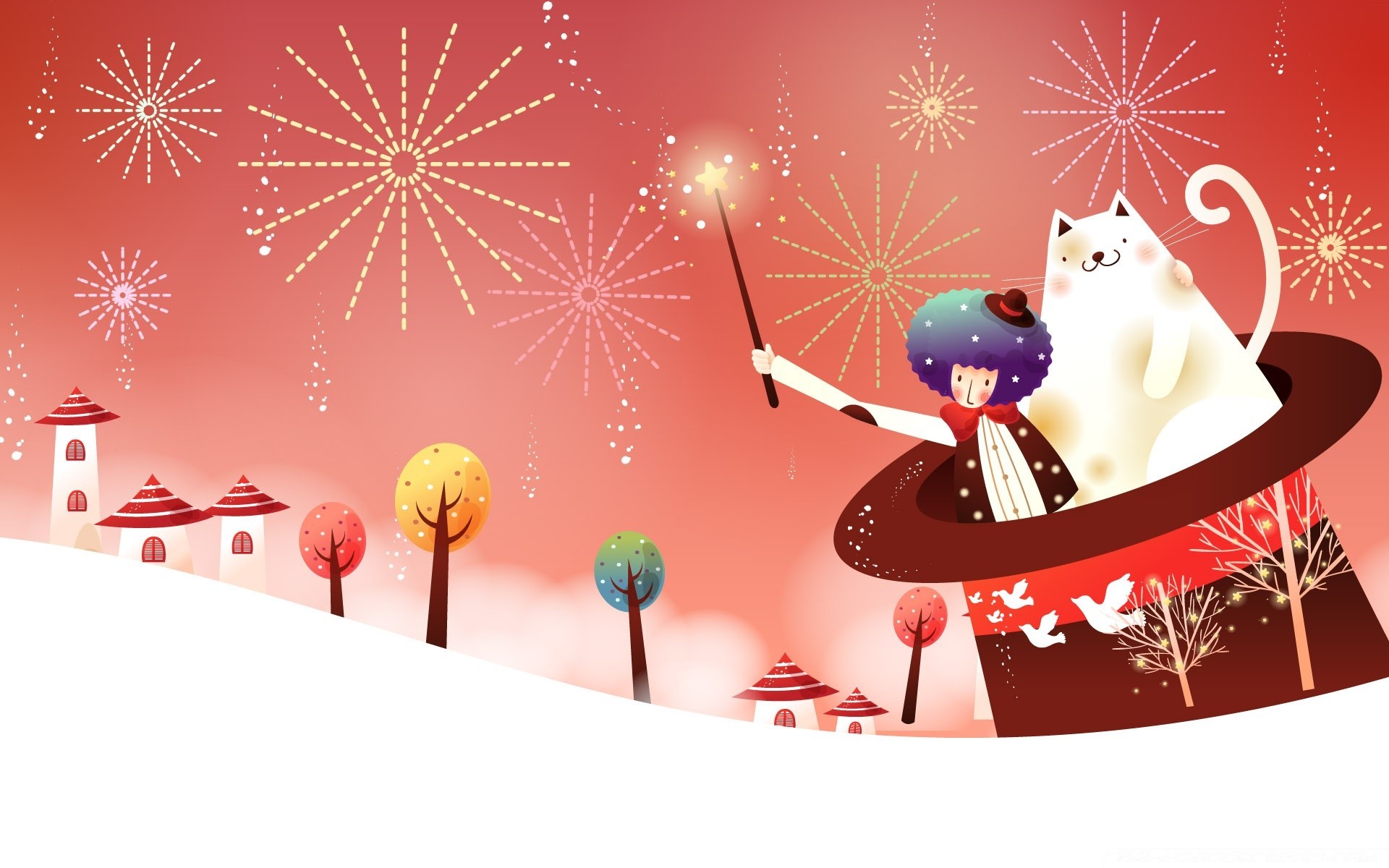 Eine Katze und ein Zauberer mit einem Hut zaubern zu Weihnachten