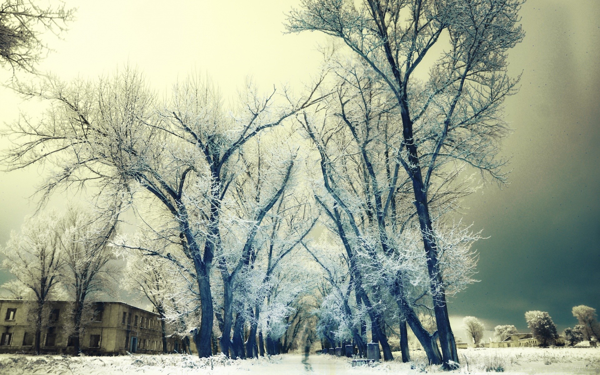 Landschaft mit schneebedeckten Straßen und Bäumen