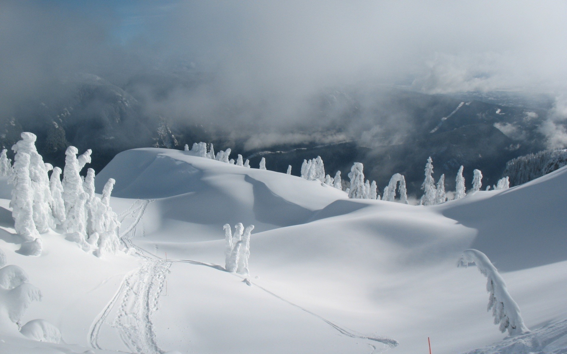 Schneebedeckte fichten am berghang über den wolkenSchneebedeckte Fichten am Berghang über den Wolken