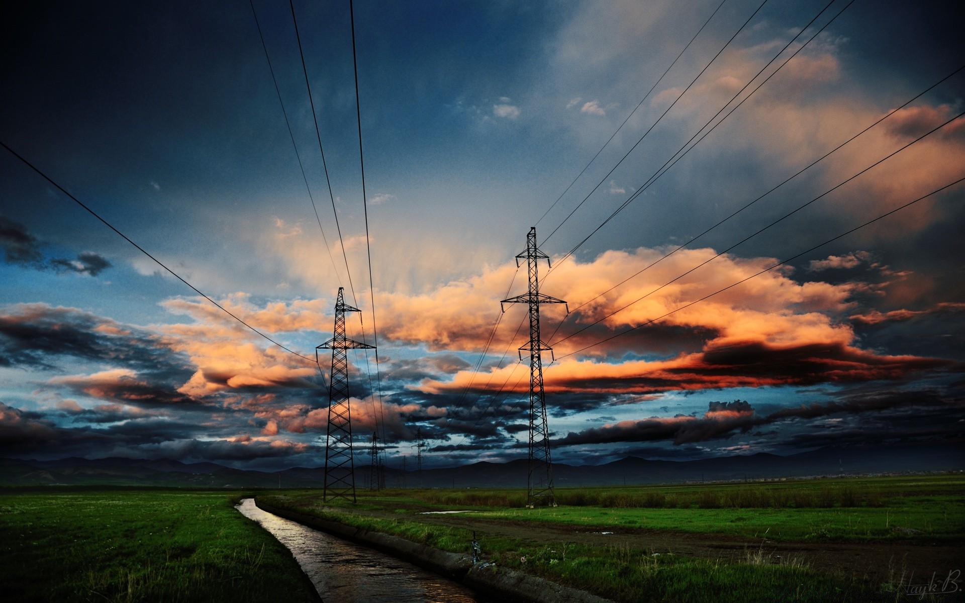 Bild einer Stromleitung bei Sonnenuntergang