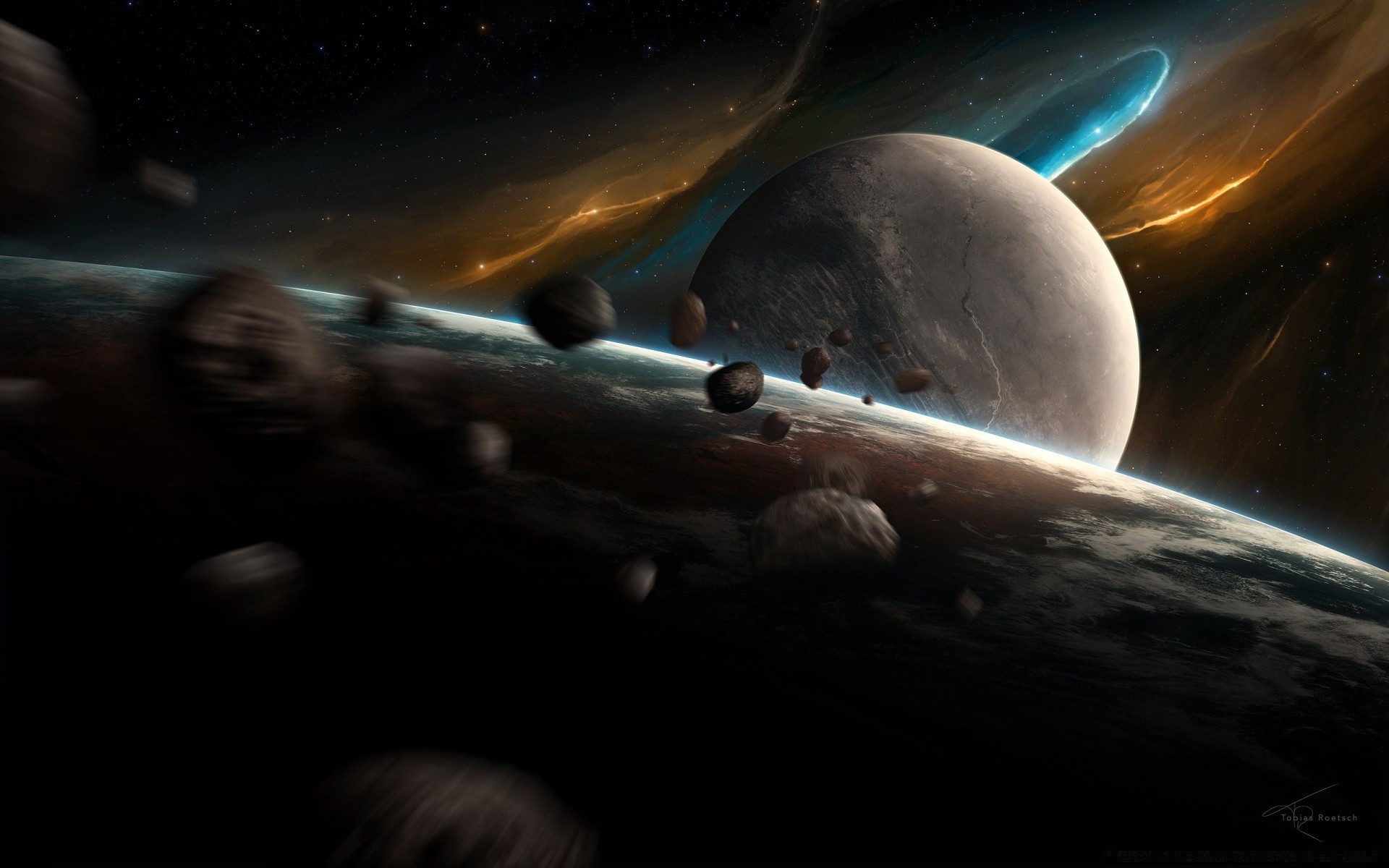 Mondansicht vom Asteroidengürtel eines anderen Planeten