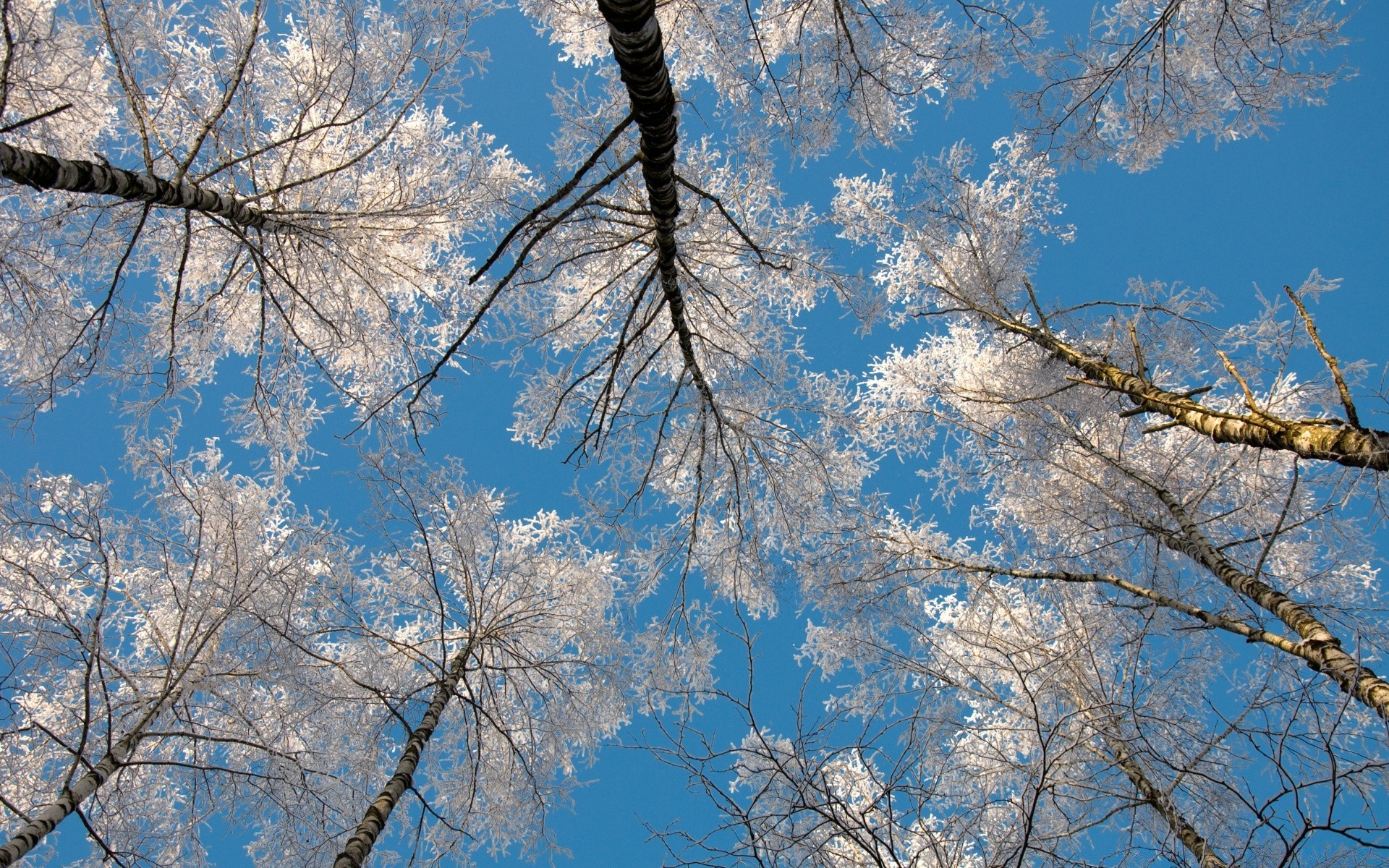 Kronen von schneebedeckten schlafenden Bäumen