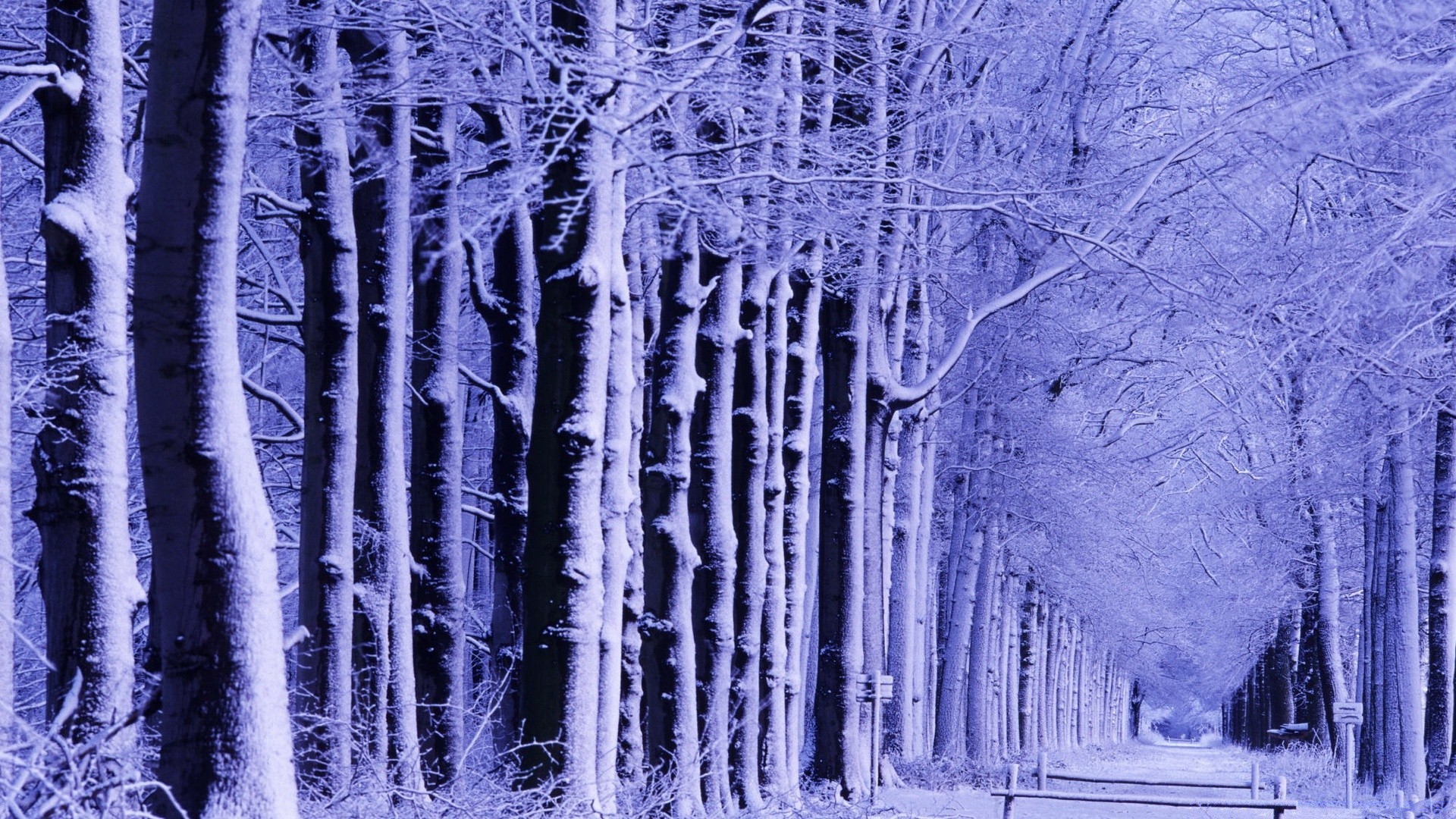 Winterhaus auf einer Wiese mit schneebedeckten Bäumen