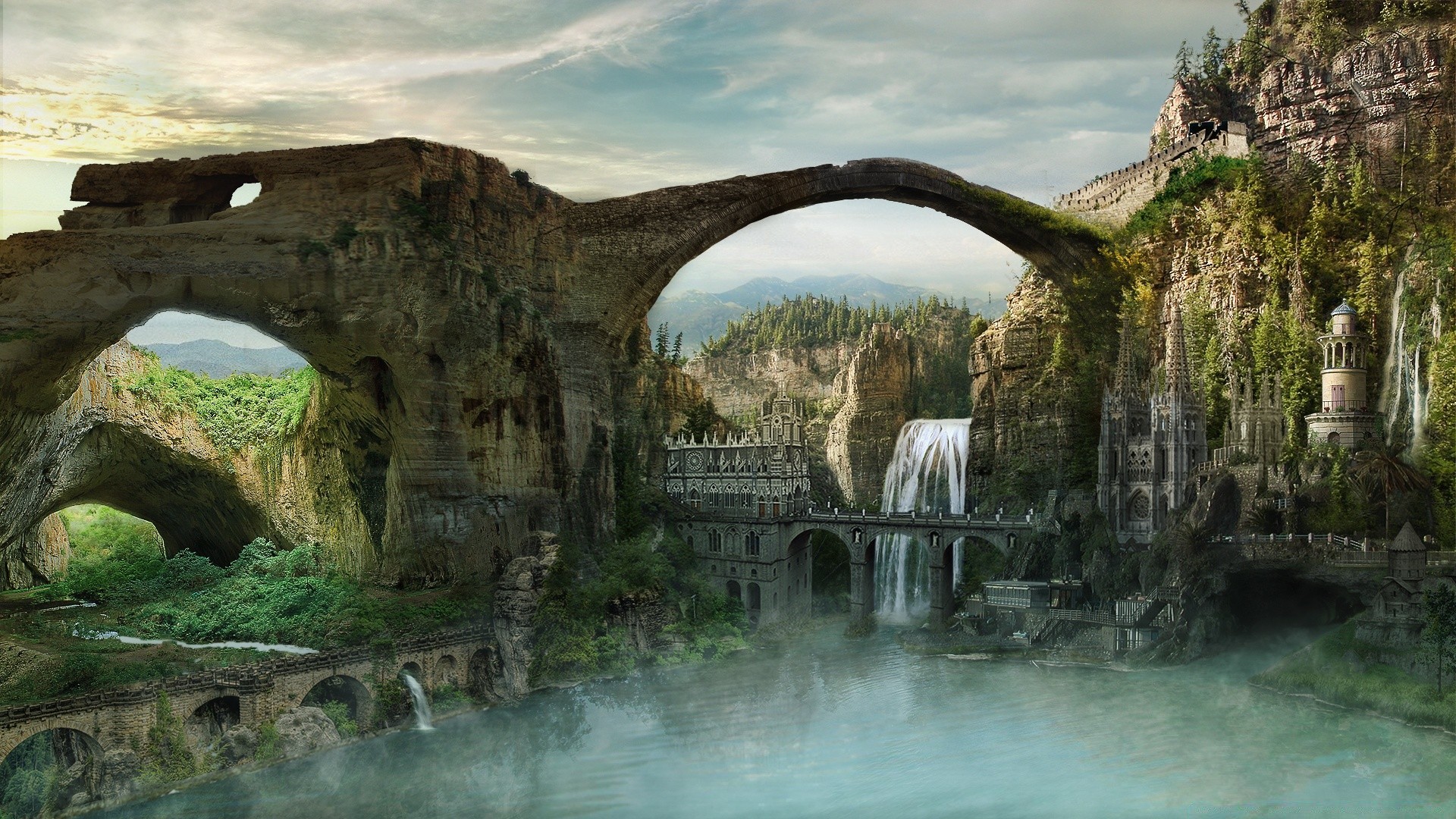 Fantasy. Das Schloss auf dem Berg. Wasserfall. Der Nebel