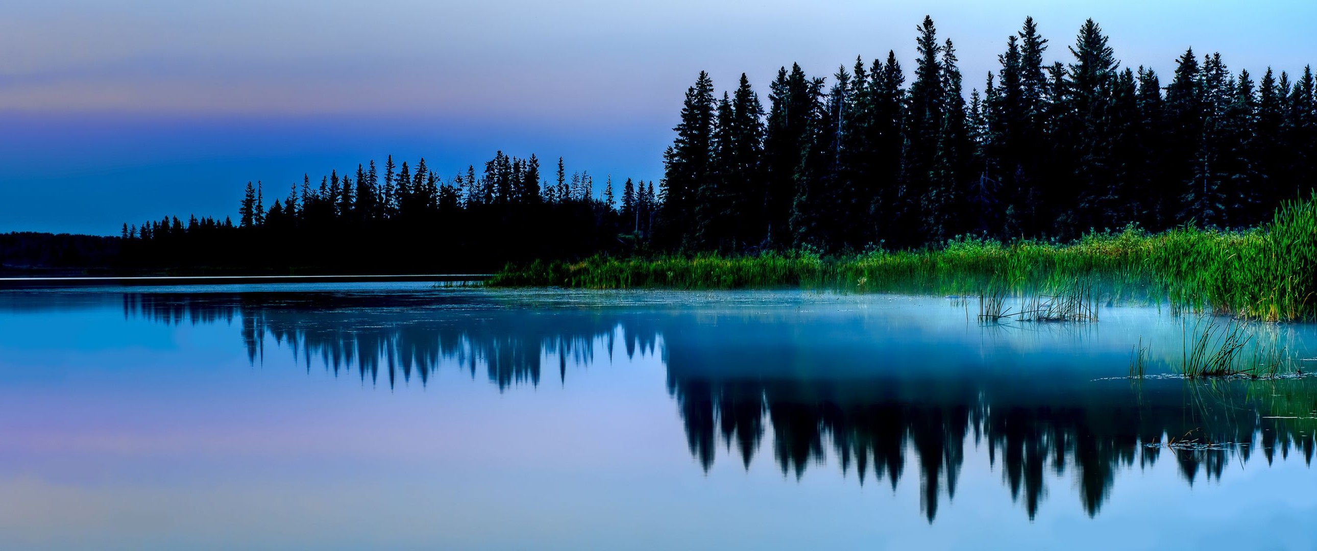 Ein Fluss mit bewölktem Himmel und Wald an den Ufern
