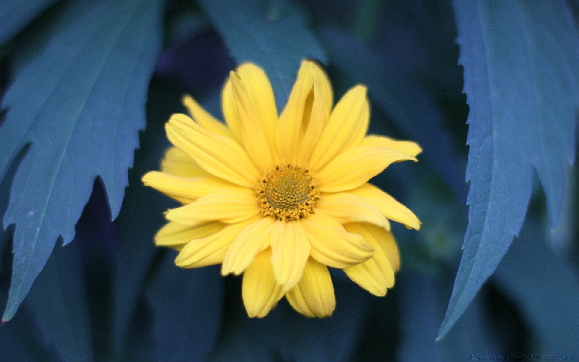 Gelbe Blume. Laub. Dunkler unscharfer Hintergrund