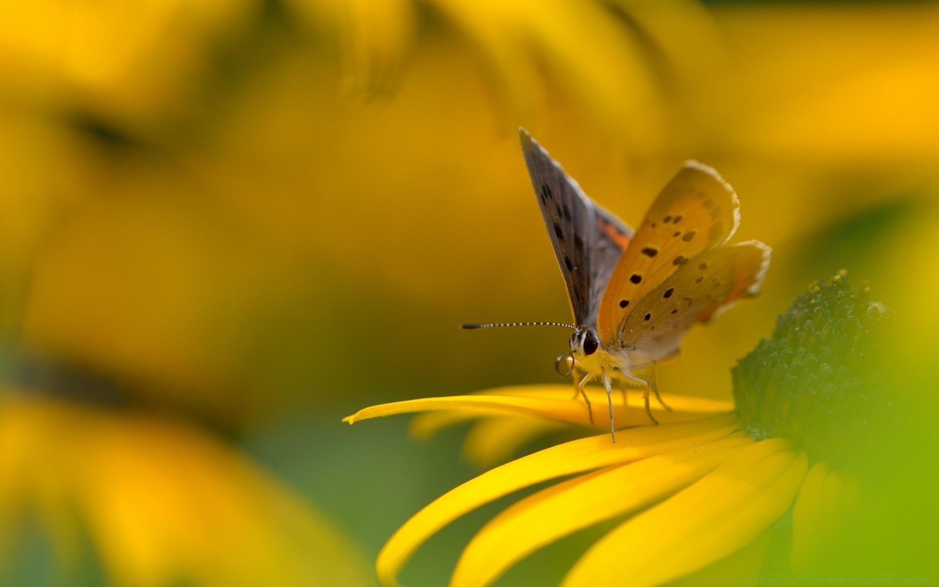 Gelbe Blume auf der rechten Seite auf verschwommenem Hintergrund