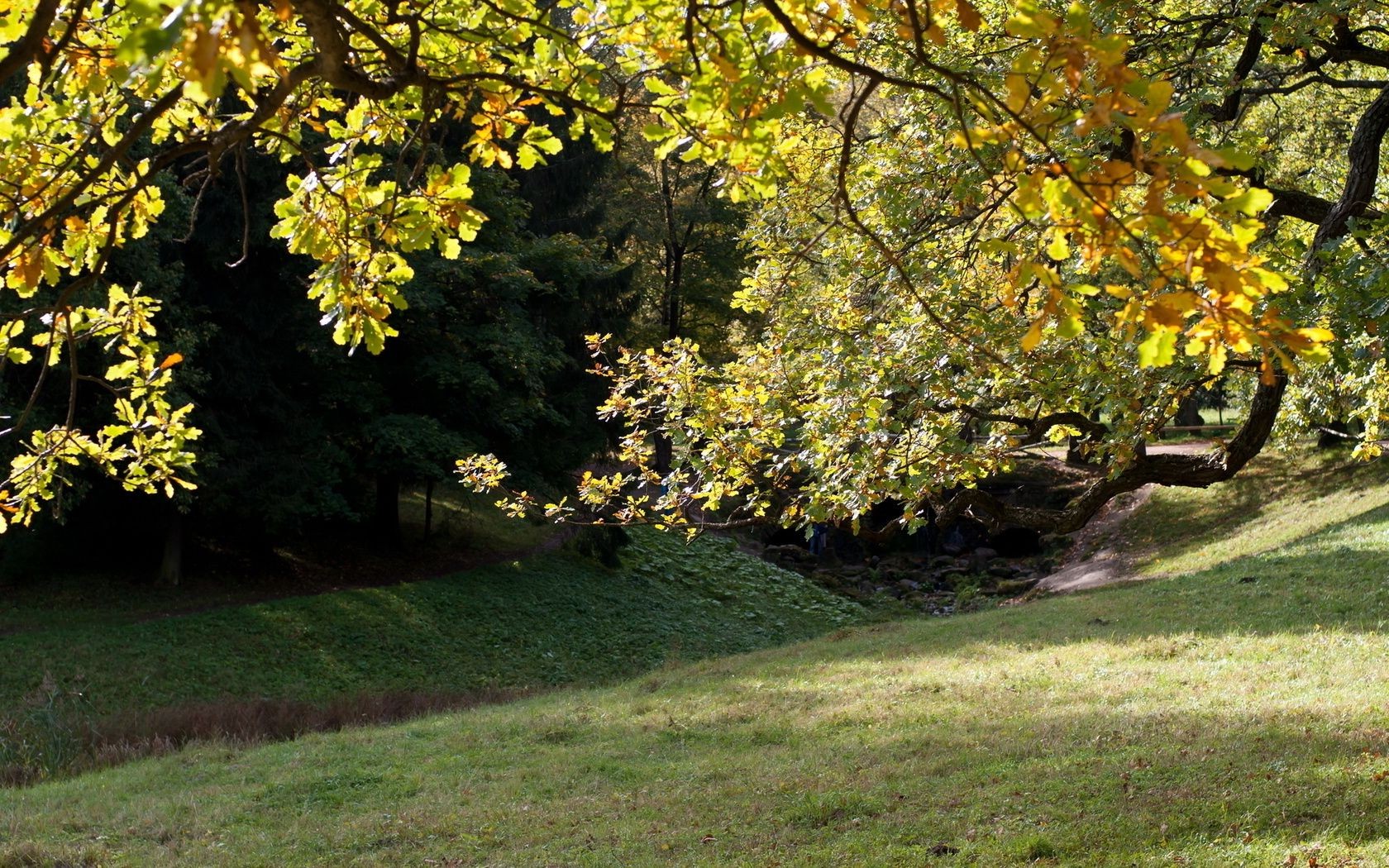 Das Licht strömt durch das gelbe Laub, der Herbst ist gekommen