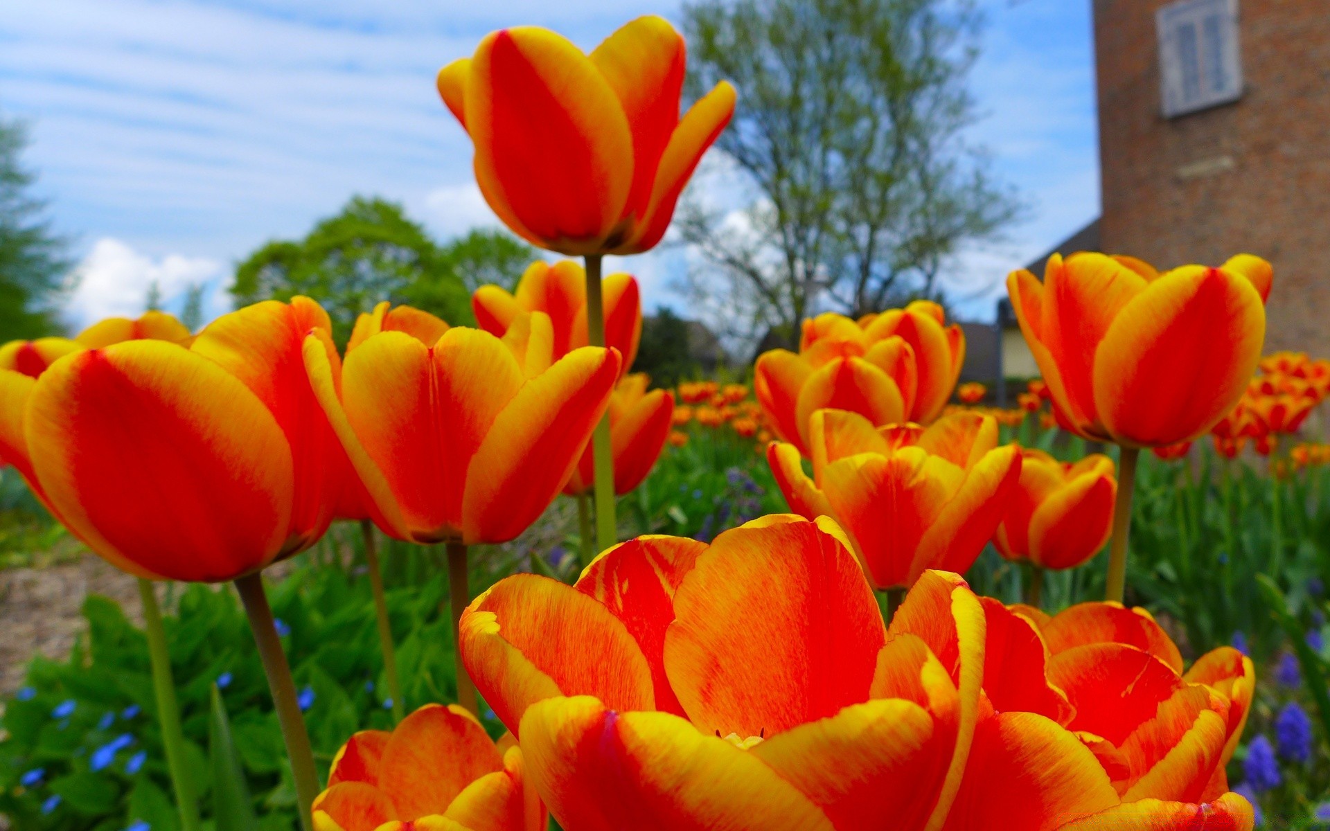 Großes Blumenbeet mit blühenden Tulpen