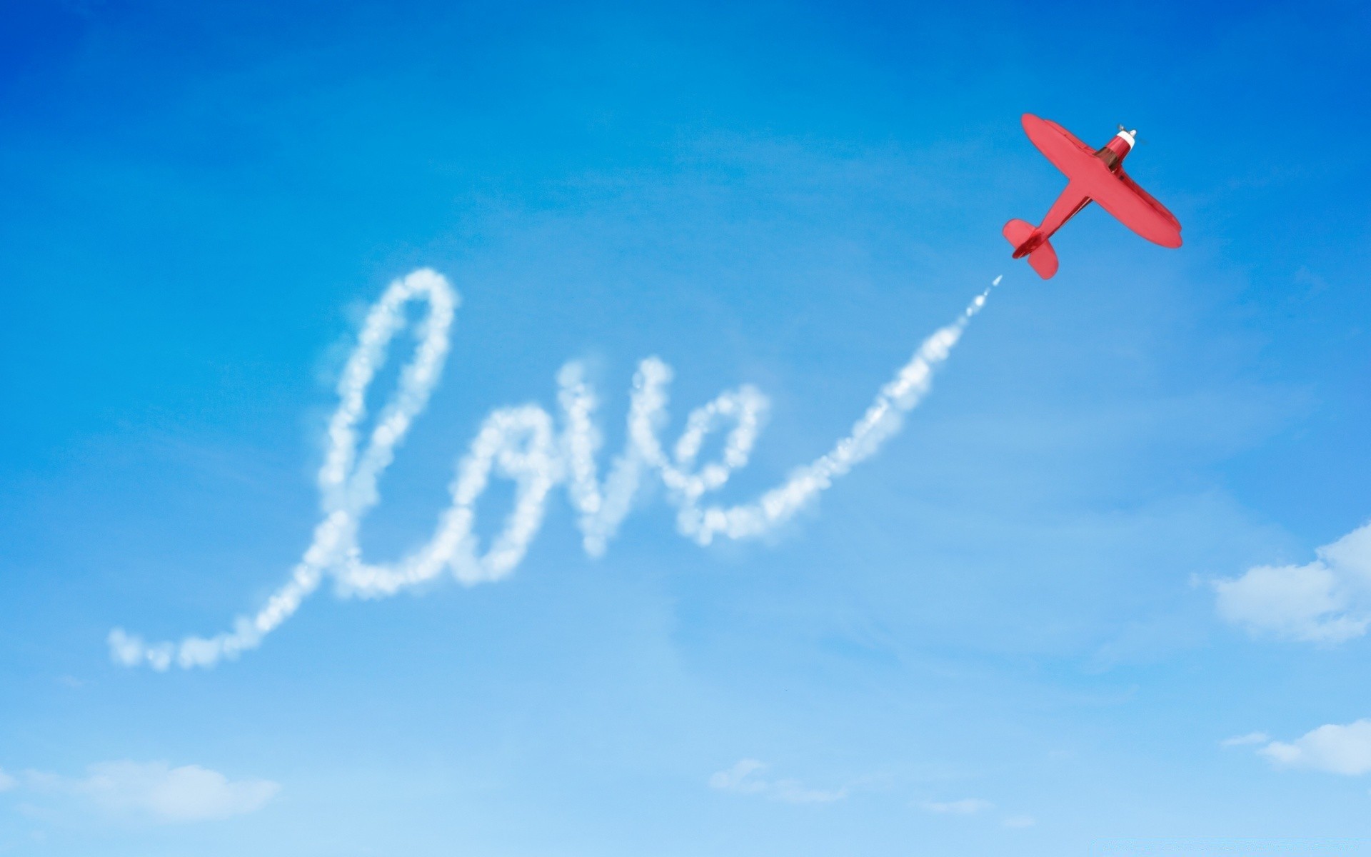 Rotes Flugzeug, das ein Herz am Himmel zeichnet
