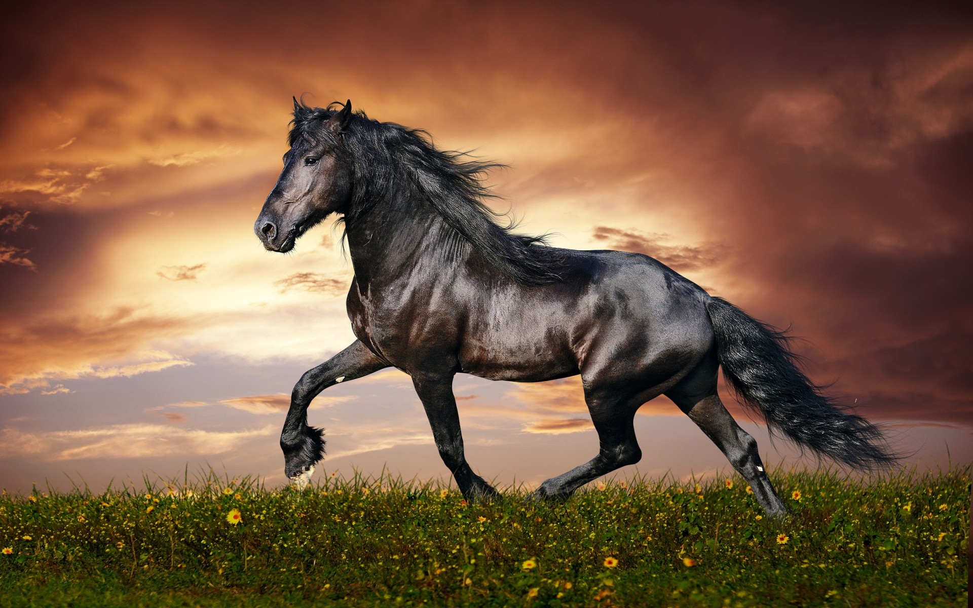 Laufendes Rabenpferd bei Sonnenuntergang