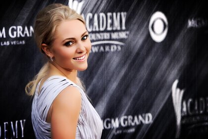 Lächelnde berühmte schauspielerin auf dem hintergrund des emblemsLächelnde berühmte Schauspielerin auf dem Hintergrund des Emblems