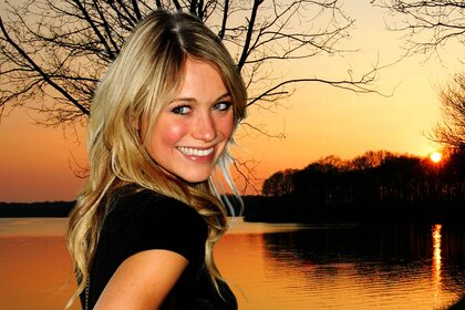 Lächelndes mädchen auf dem hintergrund des flussesLächelndes Mädchen auf dem Hintergrund des Flusses