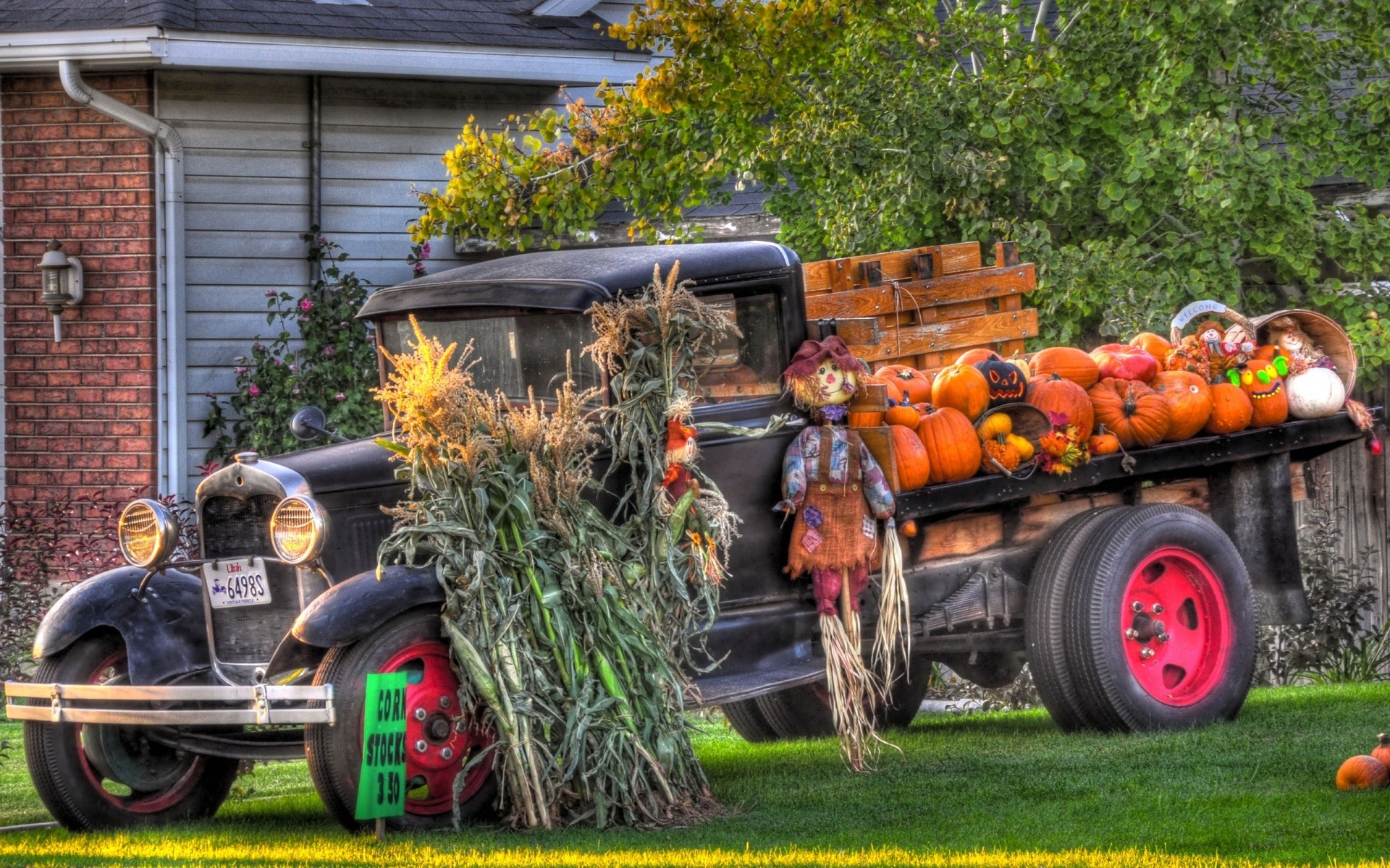Ein retro-auto, das zu halloween mit puppen, glöckchen und kürbissen geschmückt ist