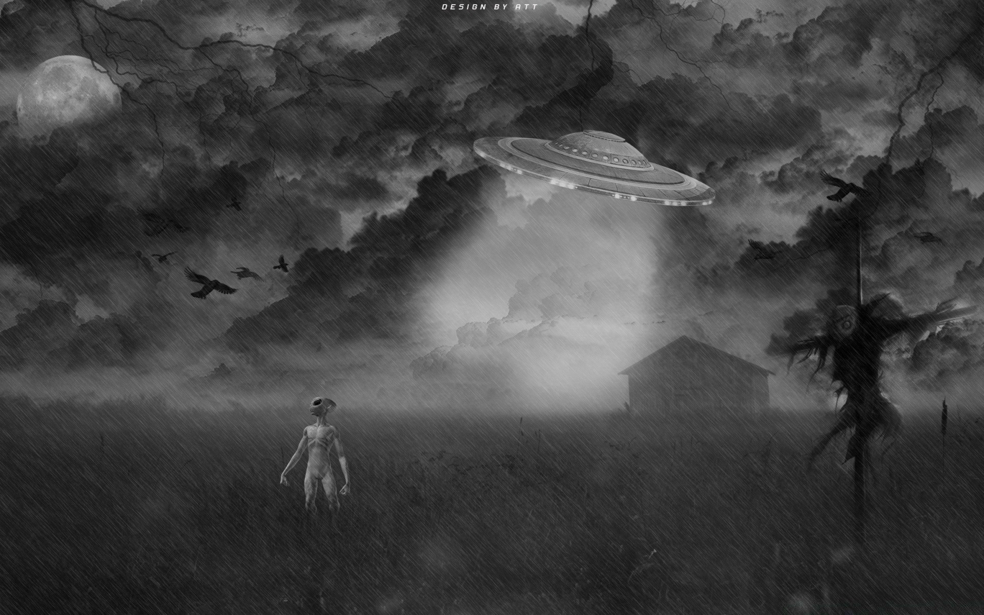Fliegende Untertasse über dem Feld in der Nacht