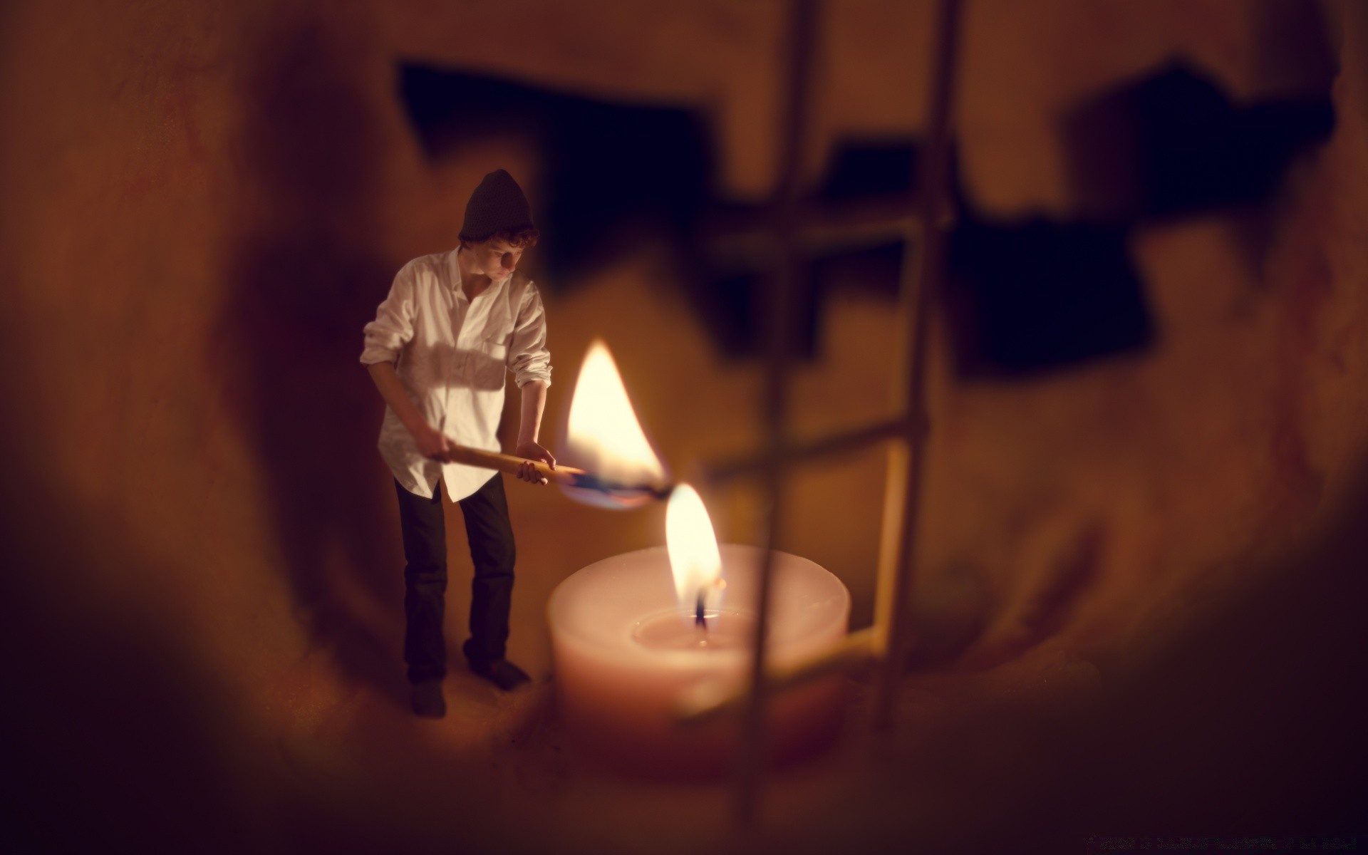 Ein Mann zündet ein Streichholz von einer Kerze an
