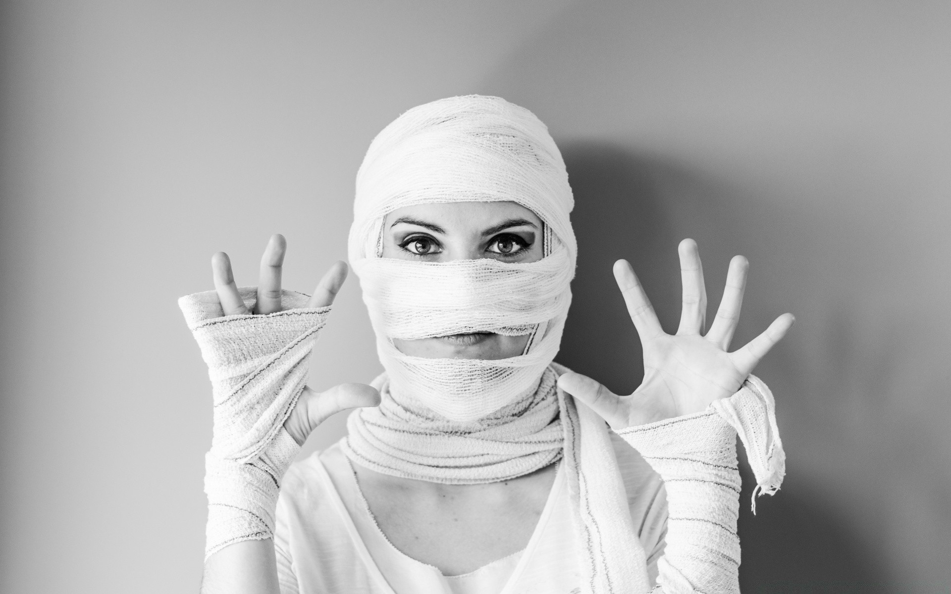 Das Gesicht und die Hände des Mädchens sind mit Bandagen umwickelt