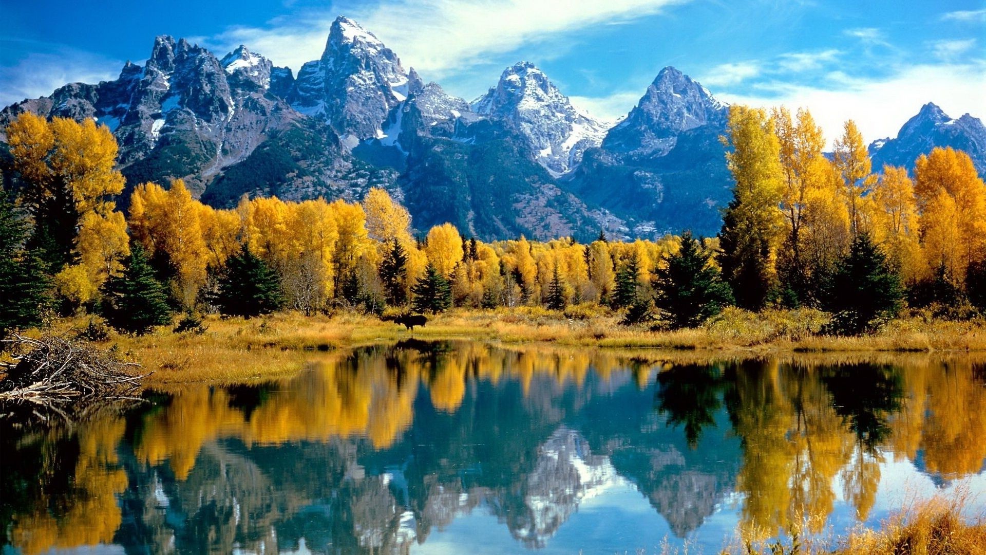 Berglandschaft. Gelbe Bäume spiegeln sich im See wider