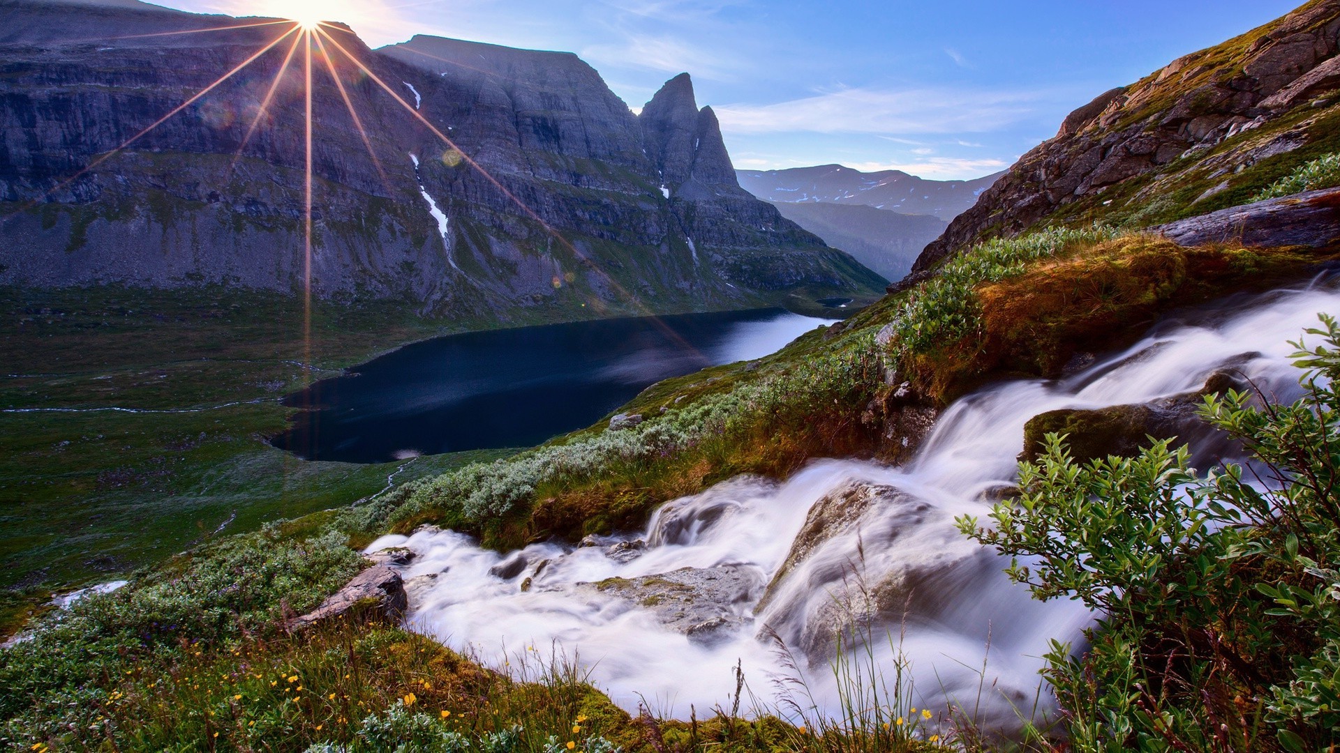 Landschaft mit Bergen, Bäumen und einem Wasserfall