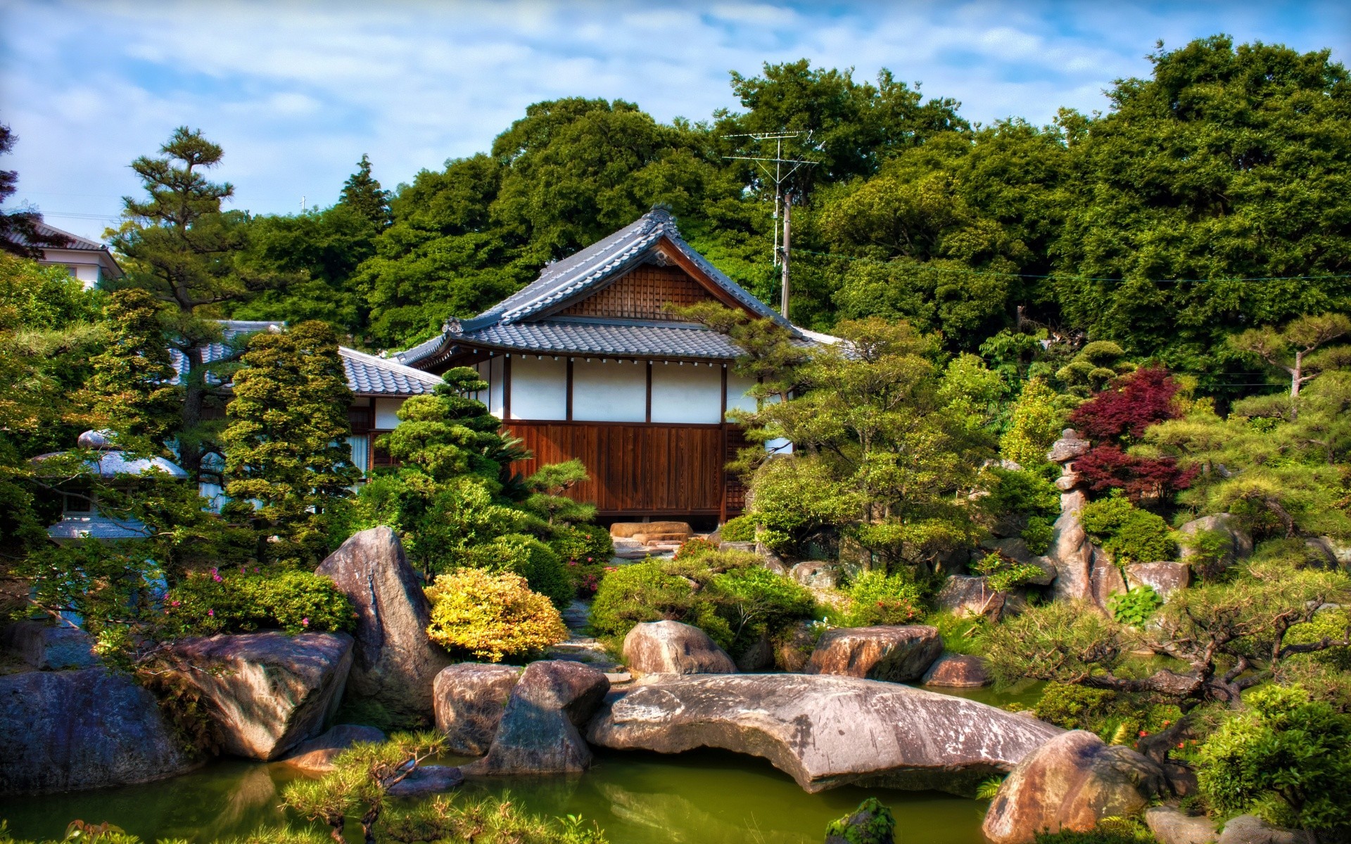 Asiatisches mehrstöckiges Haus vor dem Hintergrund des blauen Himmels