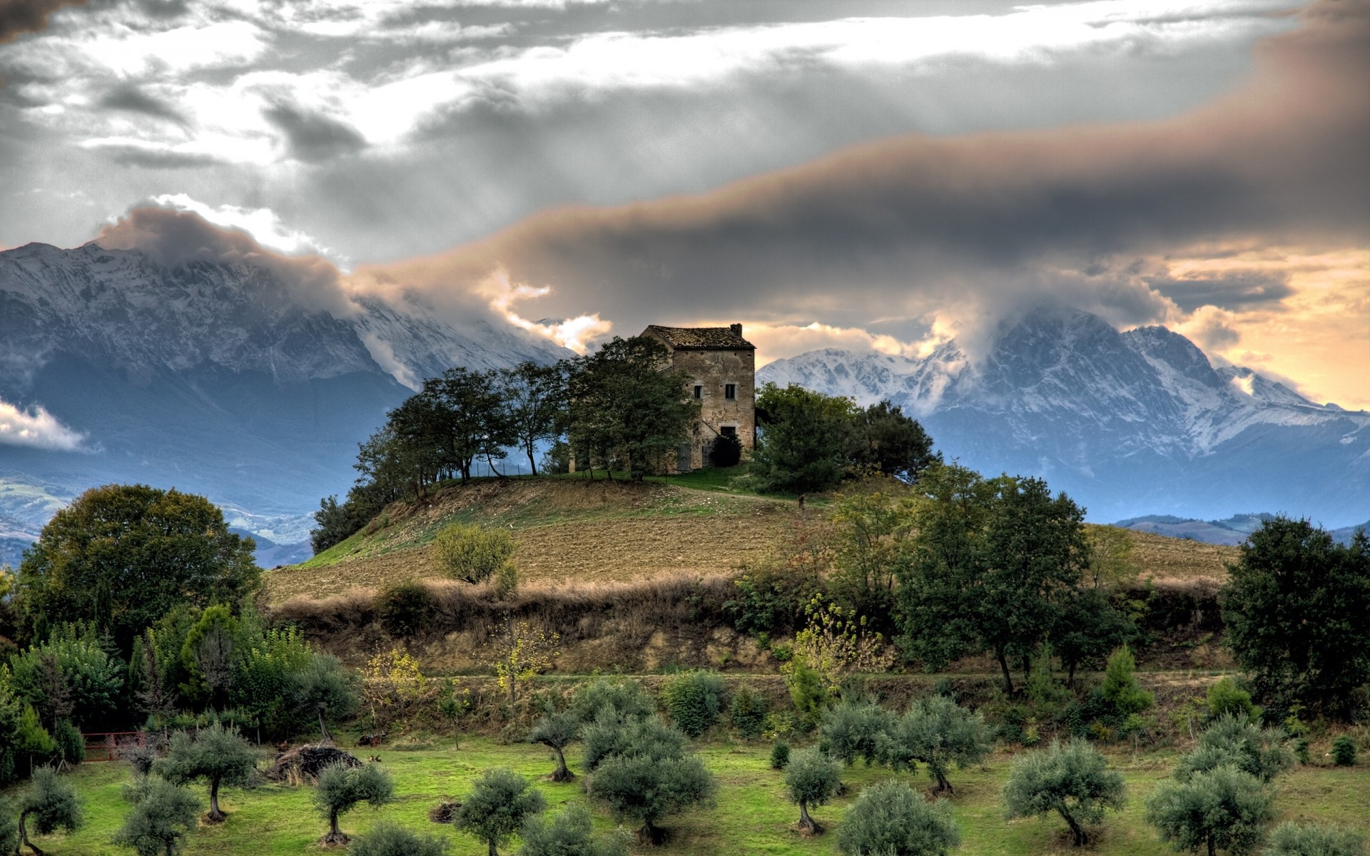 Gewitterwolken , Bäume und ein Haus auf einem Hügel