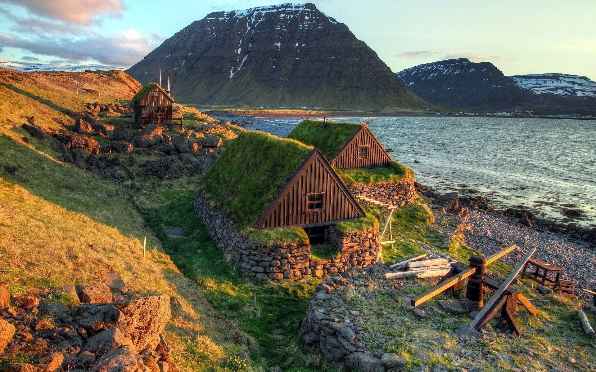 Haus am Wasser vor dem Hintergrund der Berge