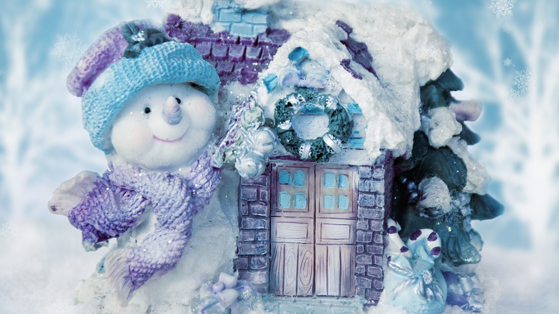 Neujahrsfoto mit Schneemann und Haus