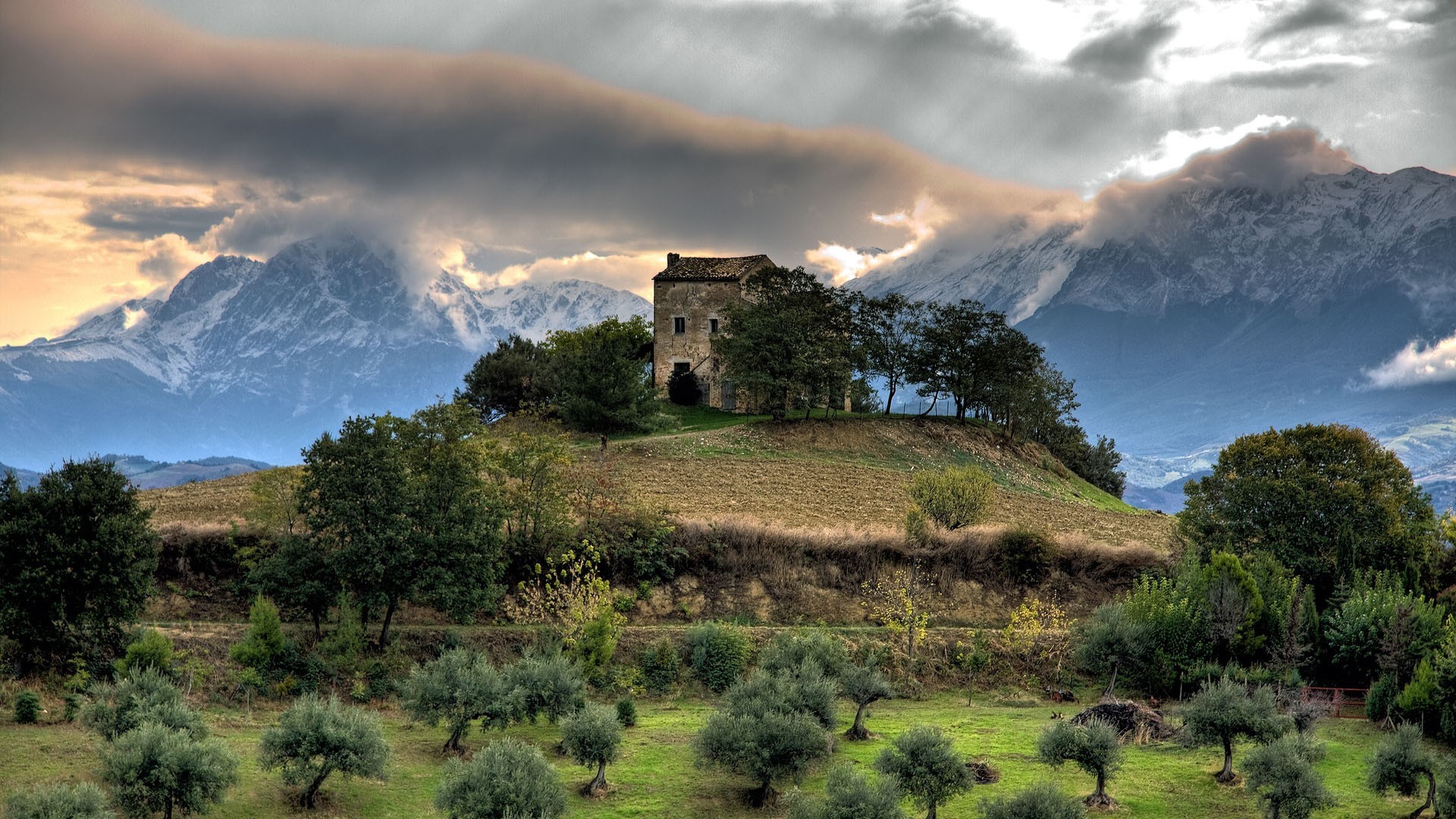 Ein Haus auf einem Hügel. landschaft mit Bergen