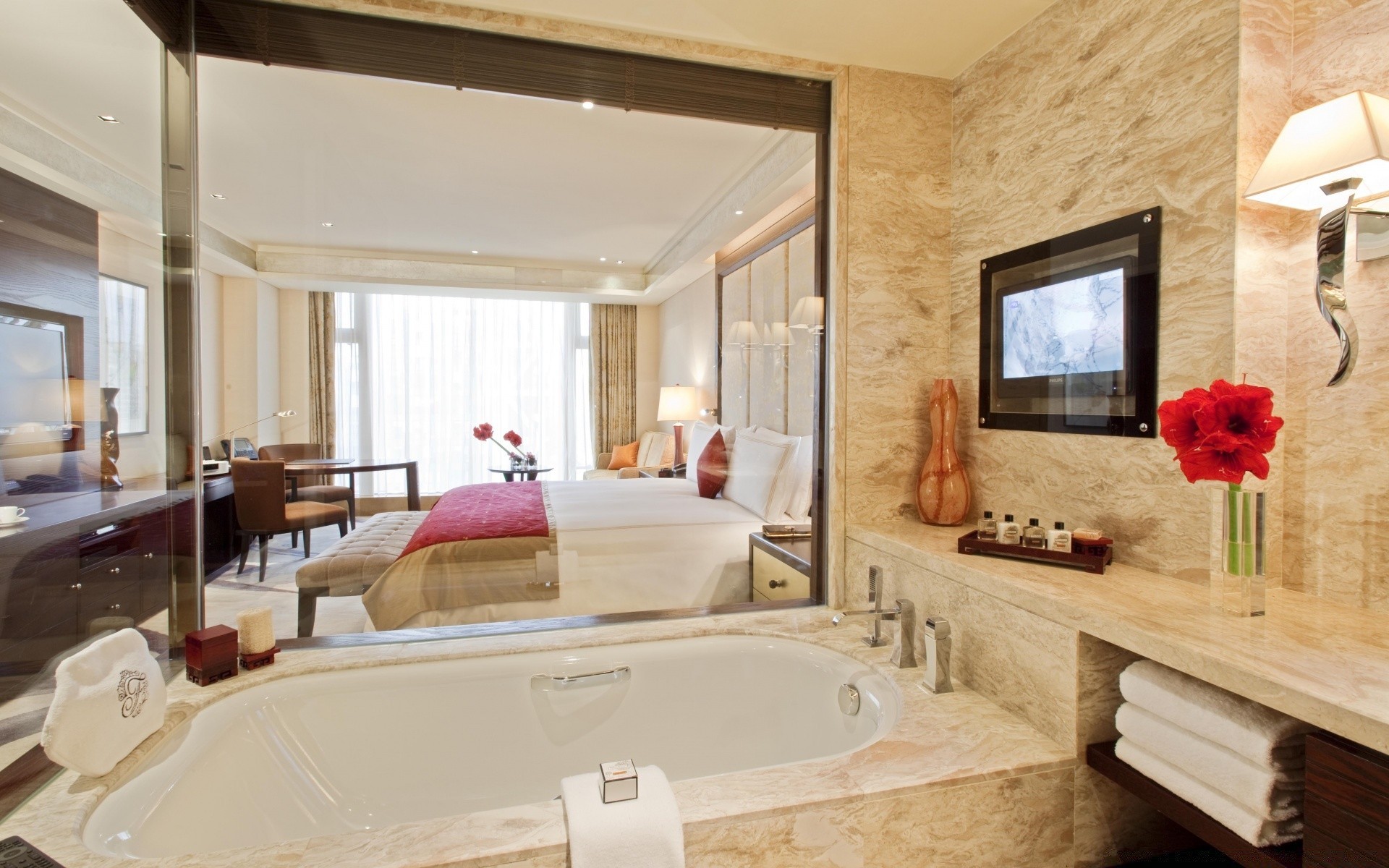 Schlafzimmer im Retro-Stil mit gemusterten Fenstern