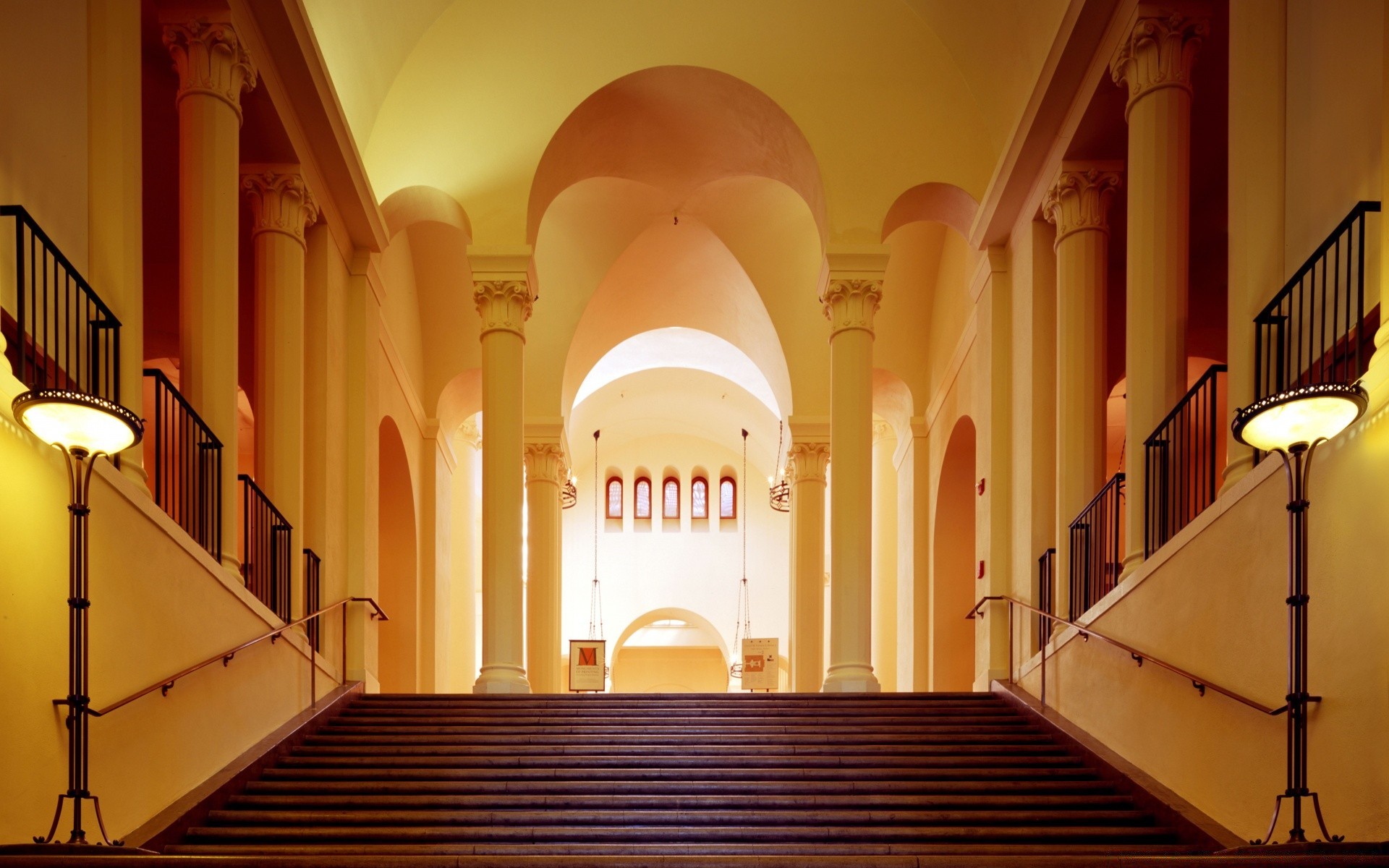 Breite Treppe im Inneren des Gebäudes mit schöner Architektur in warmen Gelbtönen