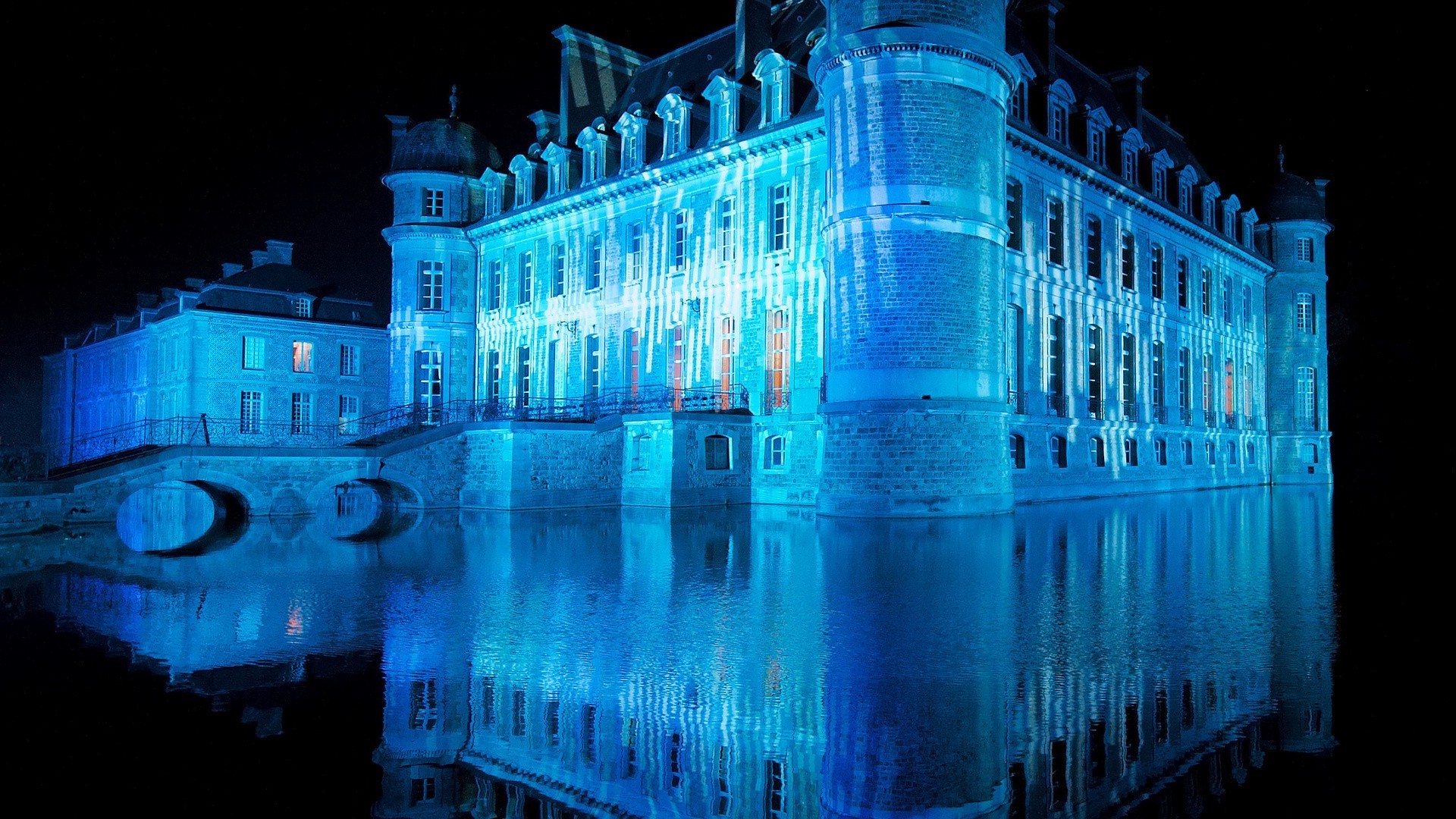 Haus auf dem Wasser mit blauer Beleuchtung